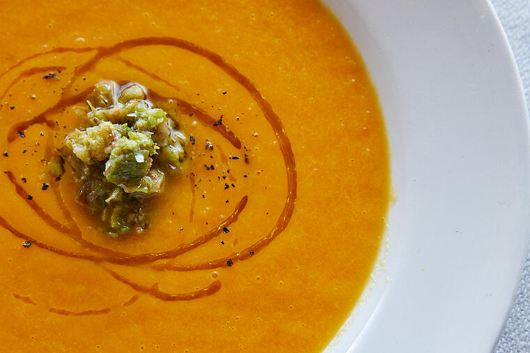 新にんじんのポタージュに、ふきのとうのアーリオオーリオを加えるだけで、華やかな味わいになります。春の...