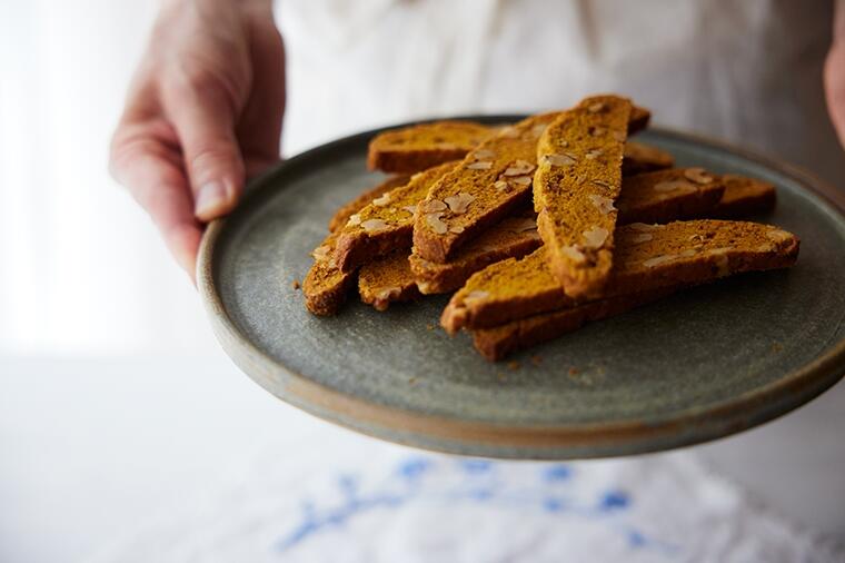 生地には卵も使わず、かぼちゃの甘味だけでつくる、軽やかなビスコッティです。パンプキンパイのスパイスで...