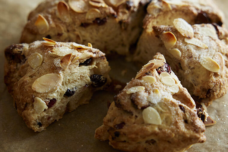スコーン生地を円形にまとめ、放射状に切り分けて焼き上げたダイナミックなスコーン。卵や乳製品、白砂糖を...