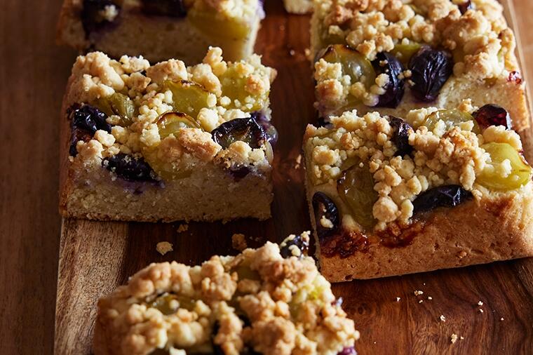 ケーキ生地の上に、ぶどうとクランブルをたっぷりのせて焼き上げた、ボリューム感のある四角いケーキです。...