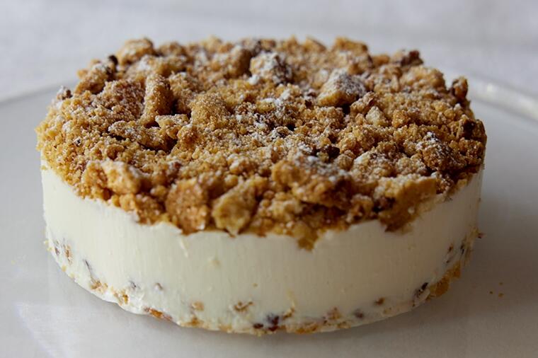 ざくざくのクランブルでサンドした、食感も楽しいレアチーズケーキです。くるみの香ばしさがアクセント。お...