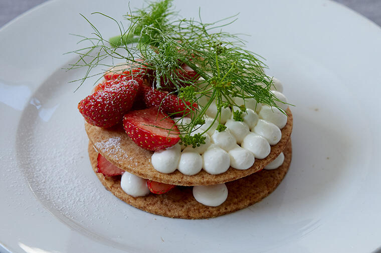 米粉と豆乳ヨーグルトでつくるパンケーキはやさしい味わい。豆腐クリームとフルーツマリネを添えると華やか...