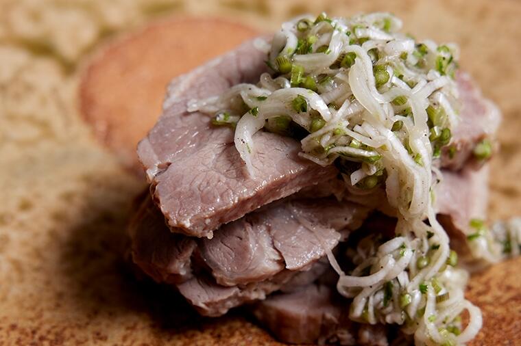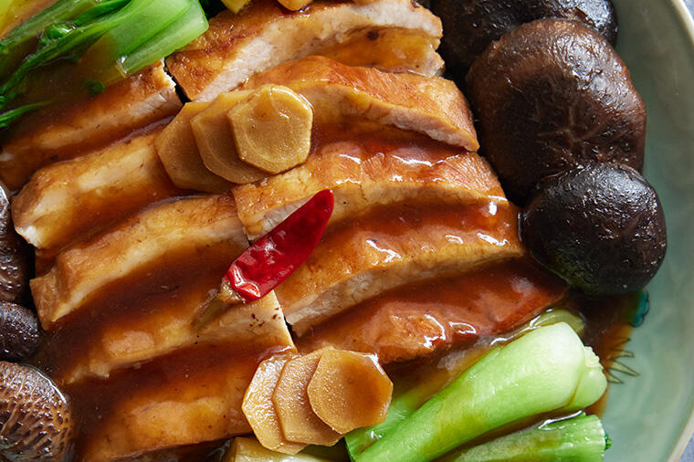 豚肉を塊のままコトコト煮て、器に盛るときに切り分けるスタイル。干し椎茸、長ねぎ、青梗菜とともに大皿に...