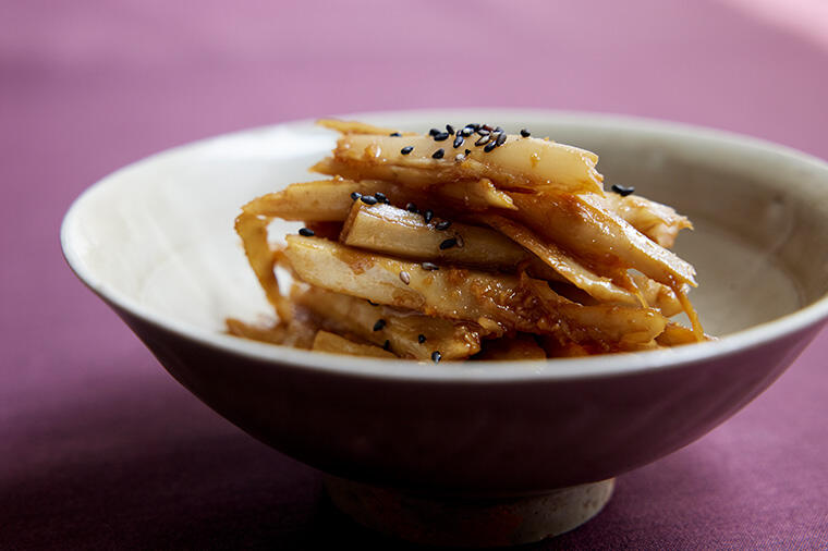 わさびの辛さが利いた醤油だれを、蒸して柔らかくなったごぼうに絡めます。れんこん、にんじんなどの根菜で...