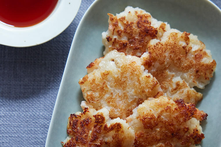 れんこんは、たたいたもの&すりおろしのダブル使い。香りのいい胡麻油で両面きつね色に香ばしく仕上げて、...