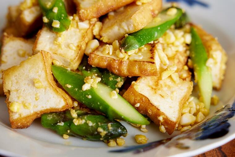 人口の10%以上がベジタリアンとされる台湾では、大豆加工品が定番食材。ここでは厚揚げと春の野菜を組み合...