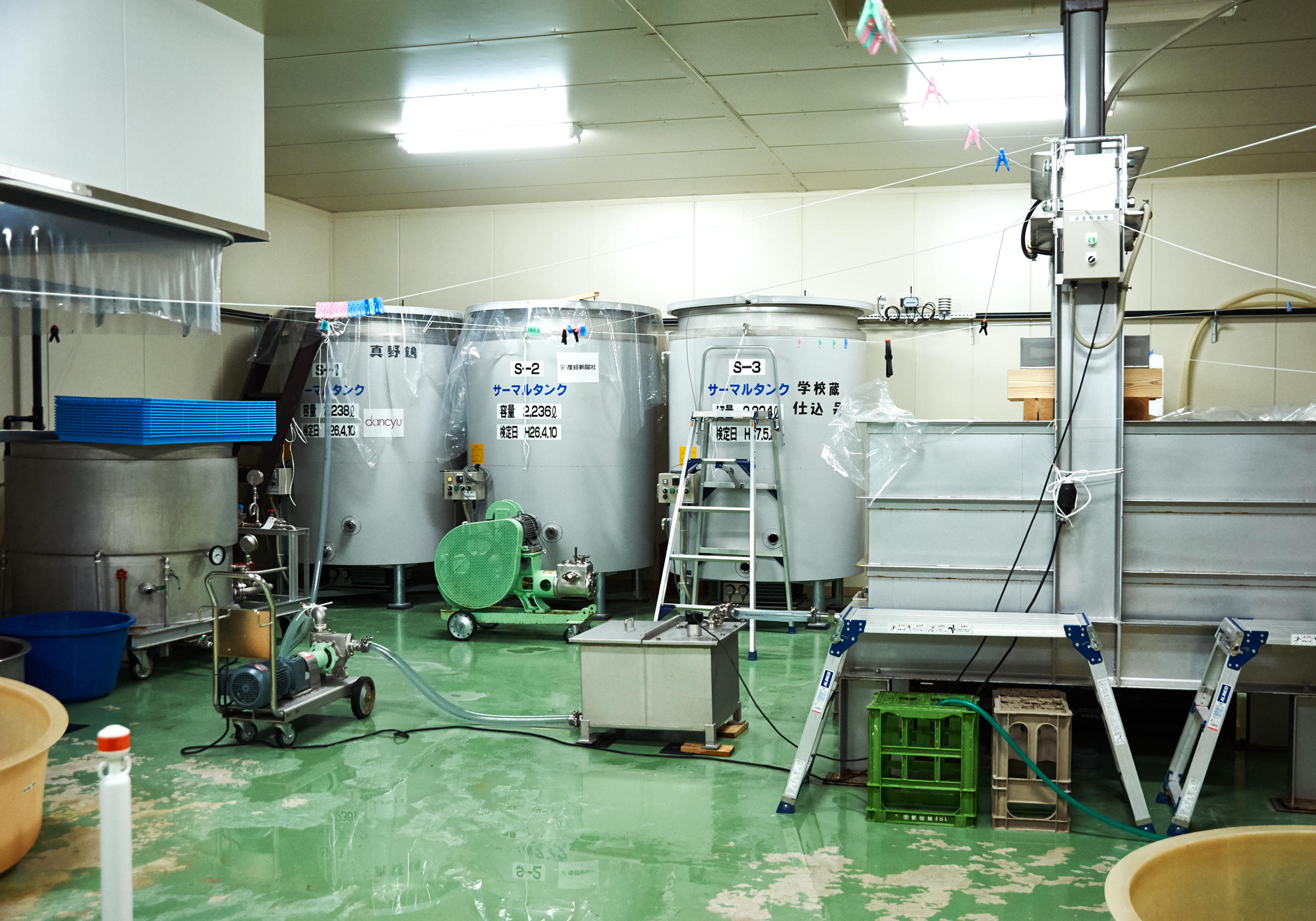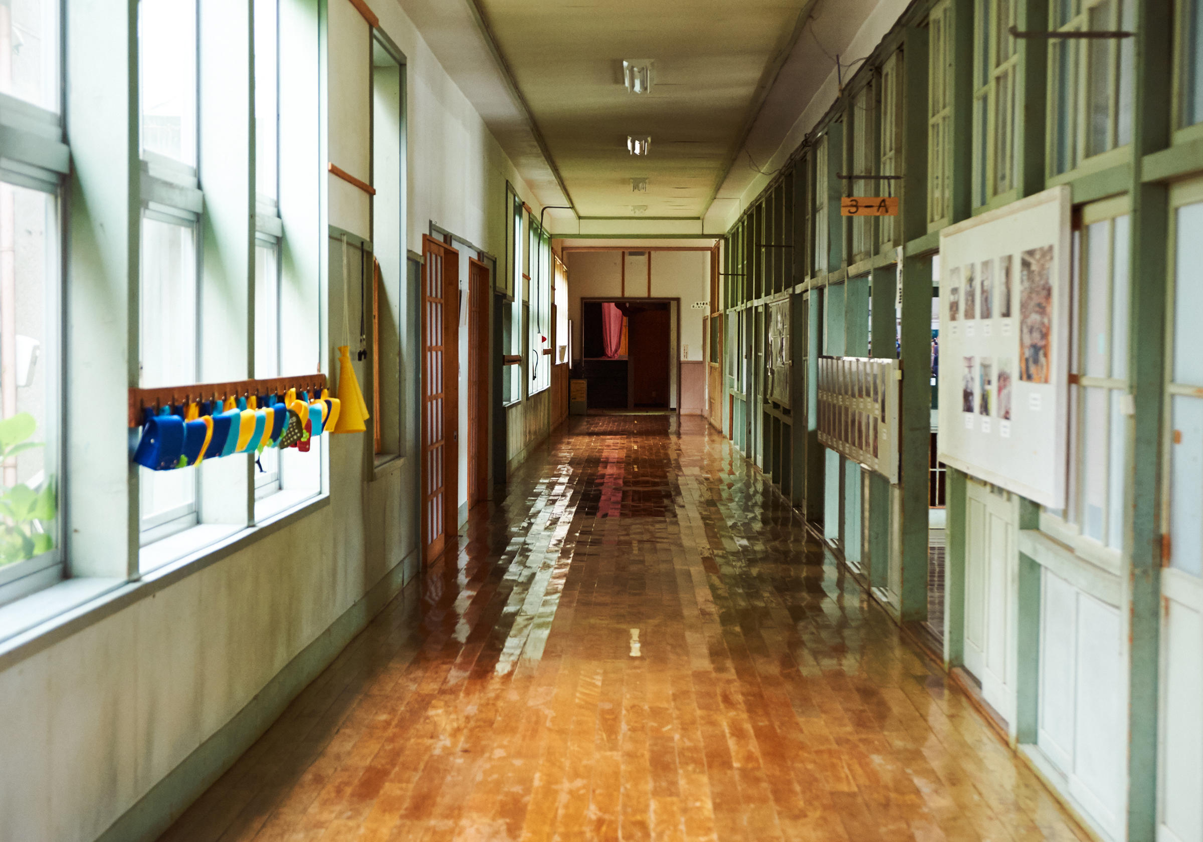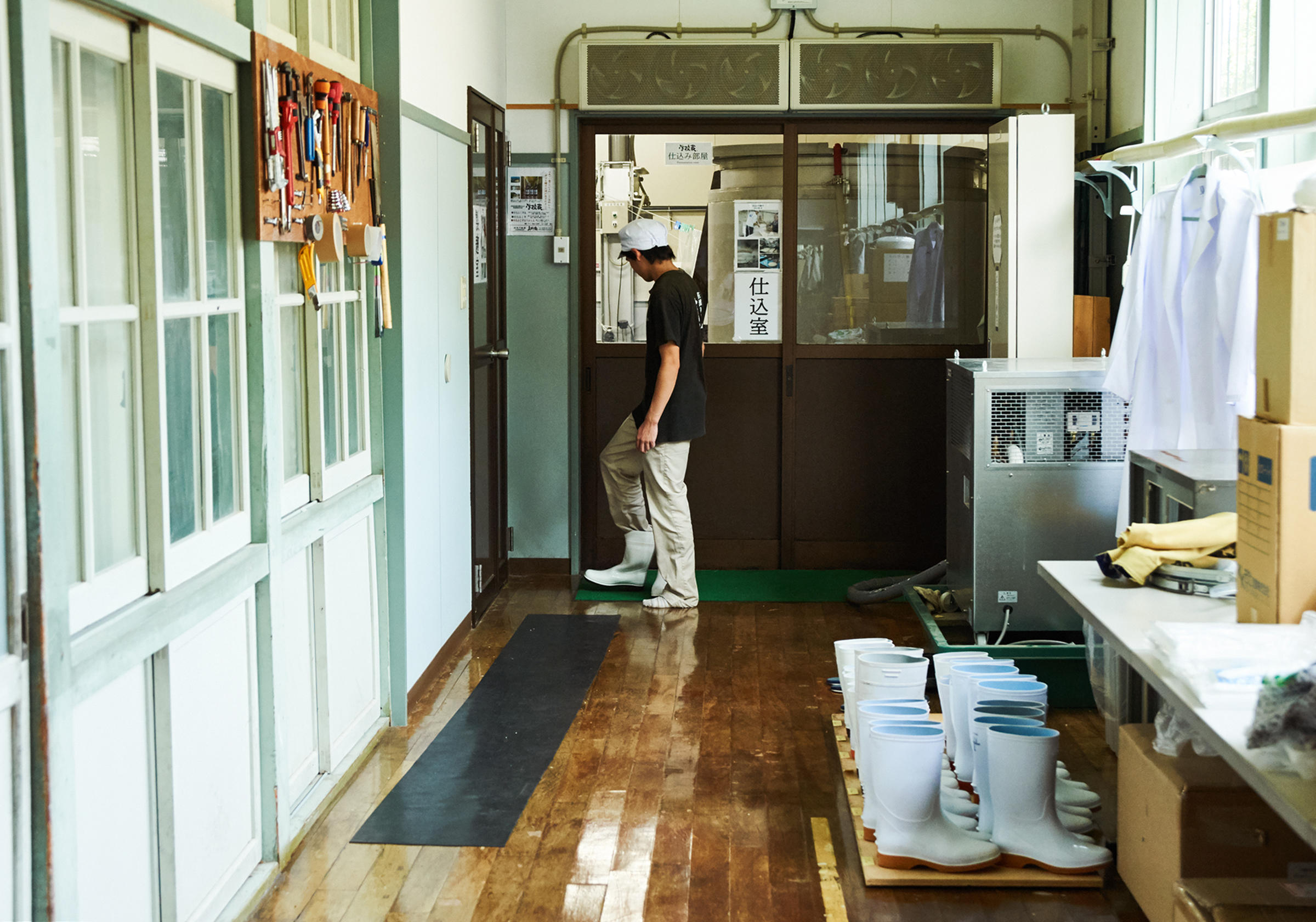 校舎の扉をガラガラと開けると、木造校舎の匂いに靴箱が並ぶ風景、いきなりセンチメンタルな気持ちにキュンとなる。きしきしと音がする長い廊下を歩いていると、つい昨日まで小学生たちが雑巾がけをしていたかのような感覚にとらわれる。木枠の大きな窓から入る自然光で照らされて、廊下はいまでも艶々と光っていた。学校蔵は仕込み部屋のほか、理科準備室を麹室に、用務員室を分析室と杜氏部屋に改装。そのほかはそのままの状態で利用している。