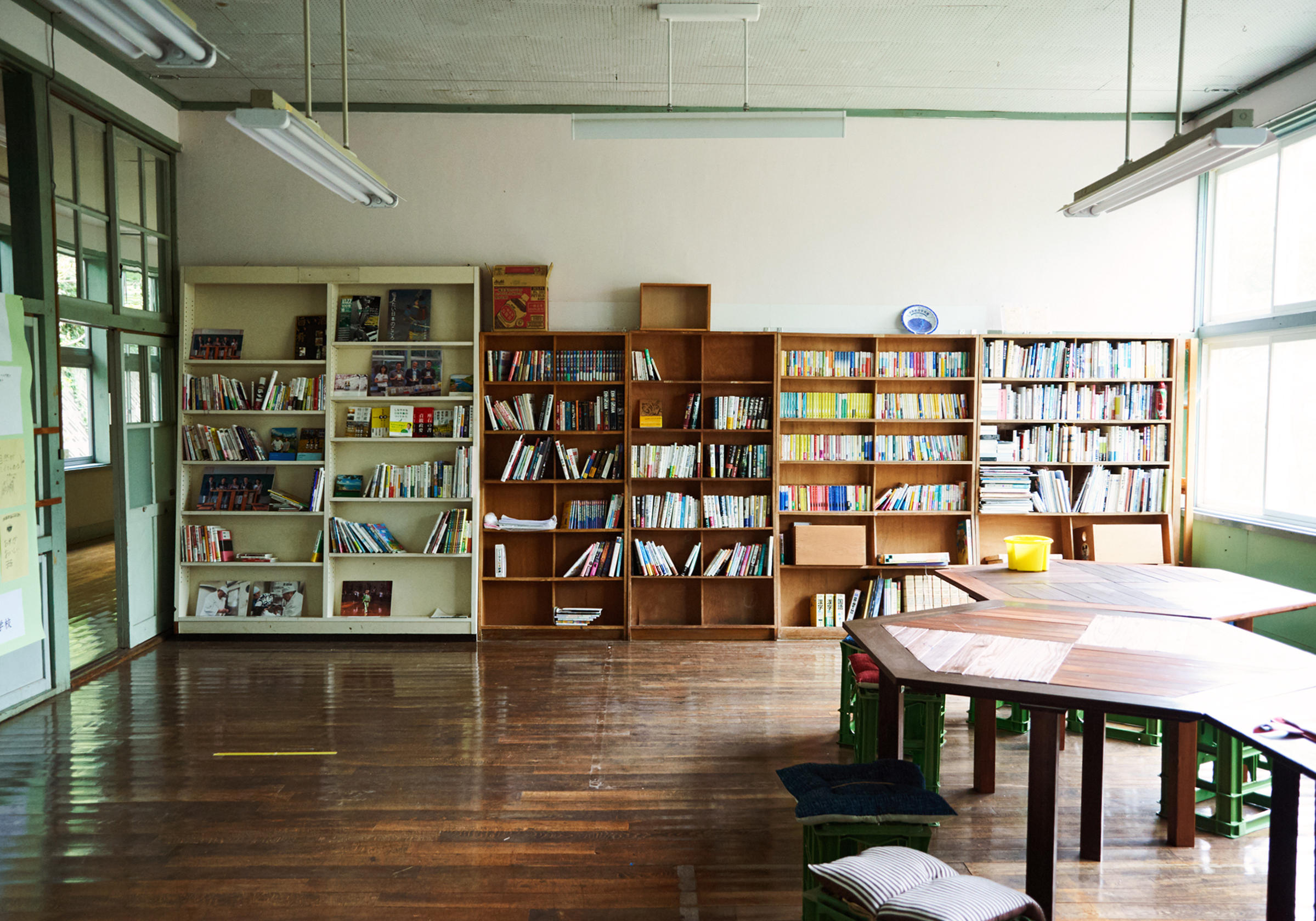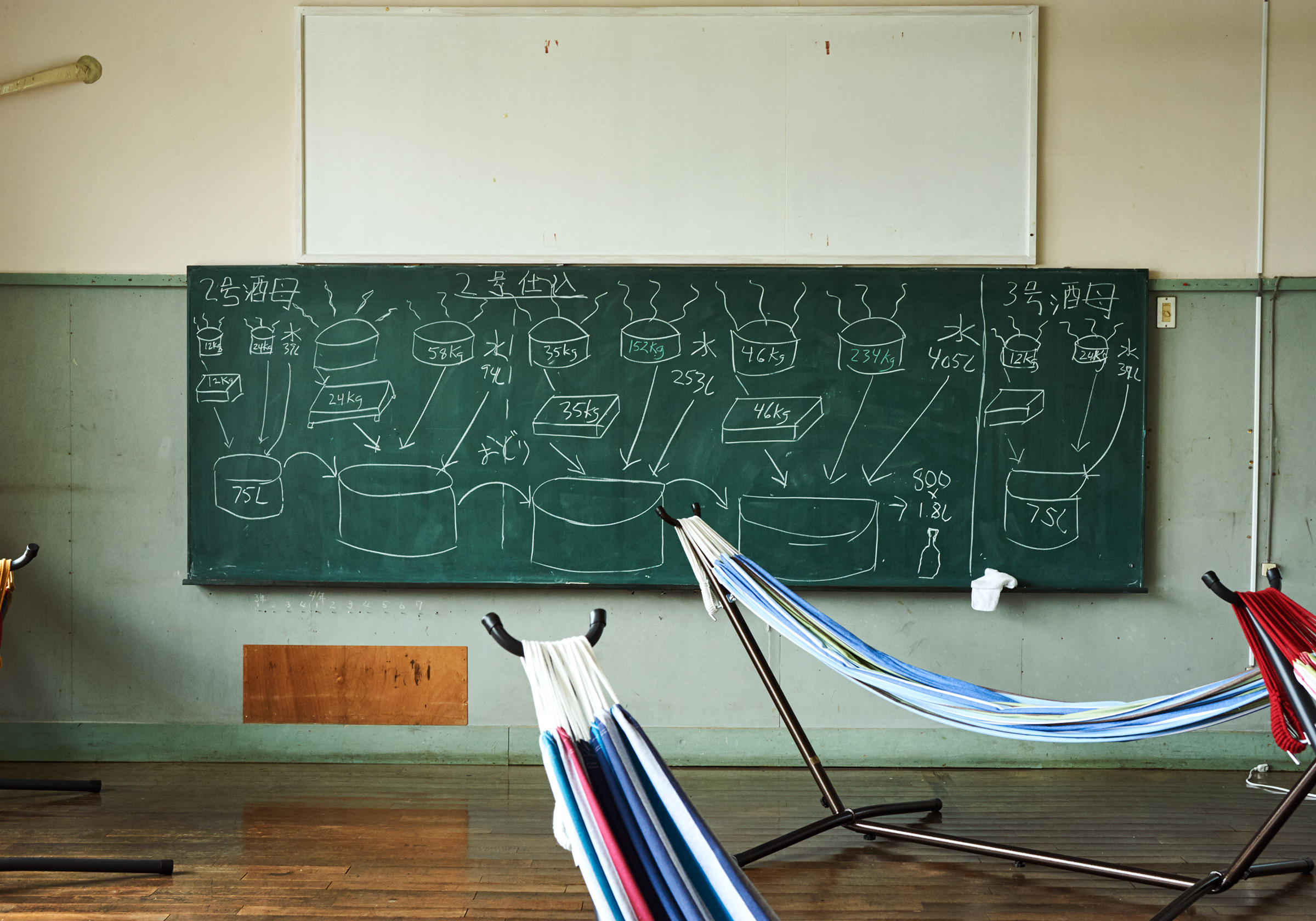 酒造りは微生物という生き物を相手にするので、その働きに合わせて造り手は動かなければいけない。小ロットといえども、冬季の酒造りとやることは同じだ。早朝にスタートする日もあるし、寝ずの番をすることだってある。水仕事や重い酒米を担いだり、きつい肉体労働も変わらない。だから安全な醸造のために、しっかりと休憩することも酒造りの仕事のひとつ。学校蔵では、かつての教室を休憩室として使っていて、ハンモックが設置されている部屋もある。造り手たちがハンモックで昼寝しているシーンは、学校蔵のひとコマになっている。1階の図書室には、佐渡の歴史や酒造りの資料が並び、こちらでも休憩をとることができる。