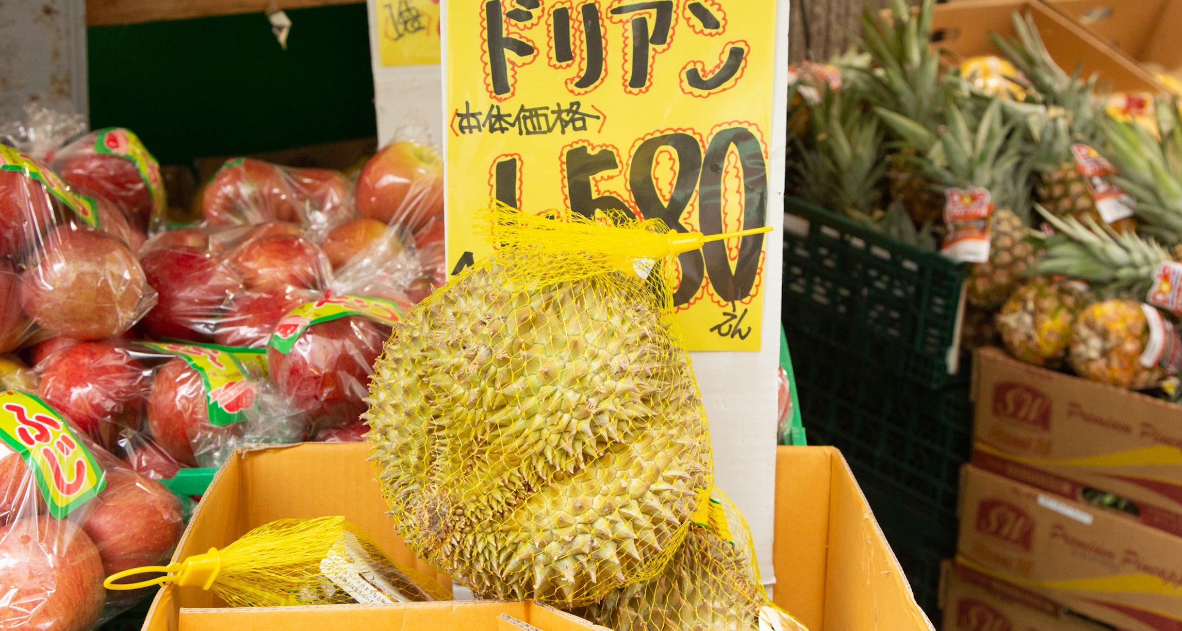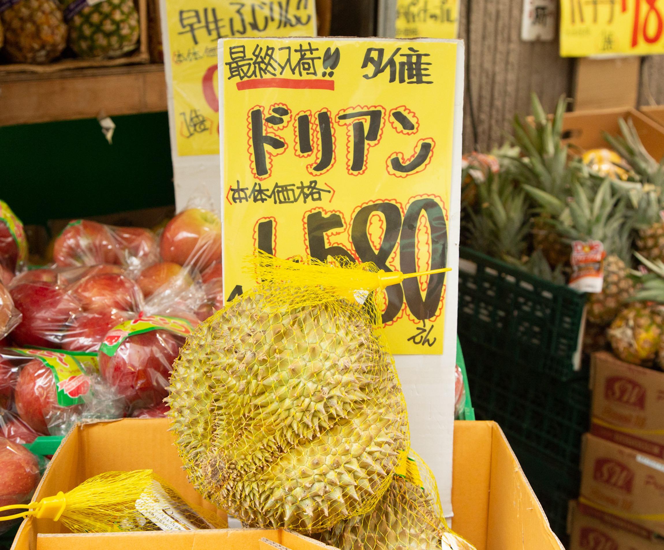 店の軒先には白菜やキャベツ、大根など、私たちがよく知る野菜のほか、ドリアンやドラゴンフルーツといった南国系のフルーツが目を引く。「新宿辺りの高級フルーツ専門店に比べれば、だいぶお手頃ですよ」と荒巻さんは笑う。