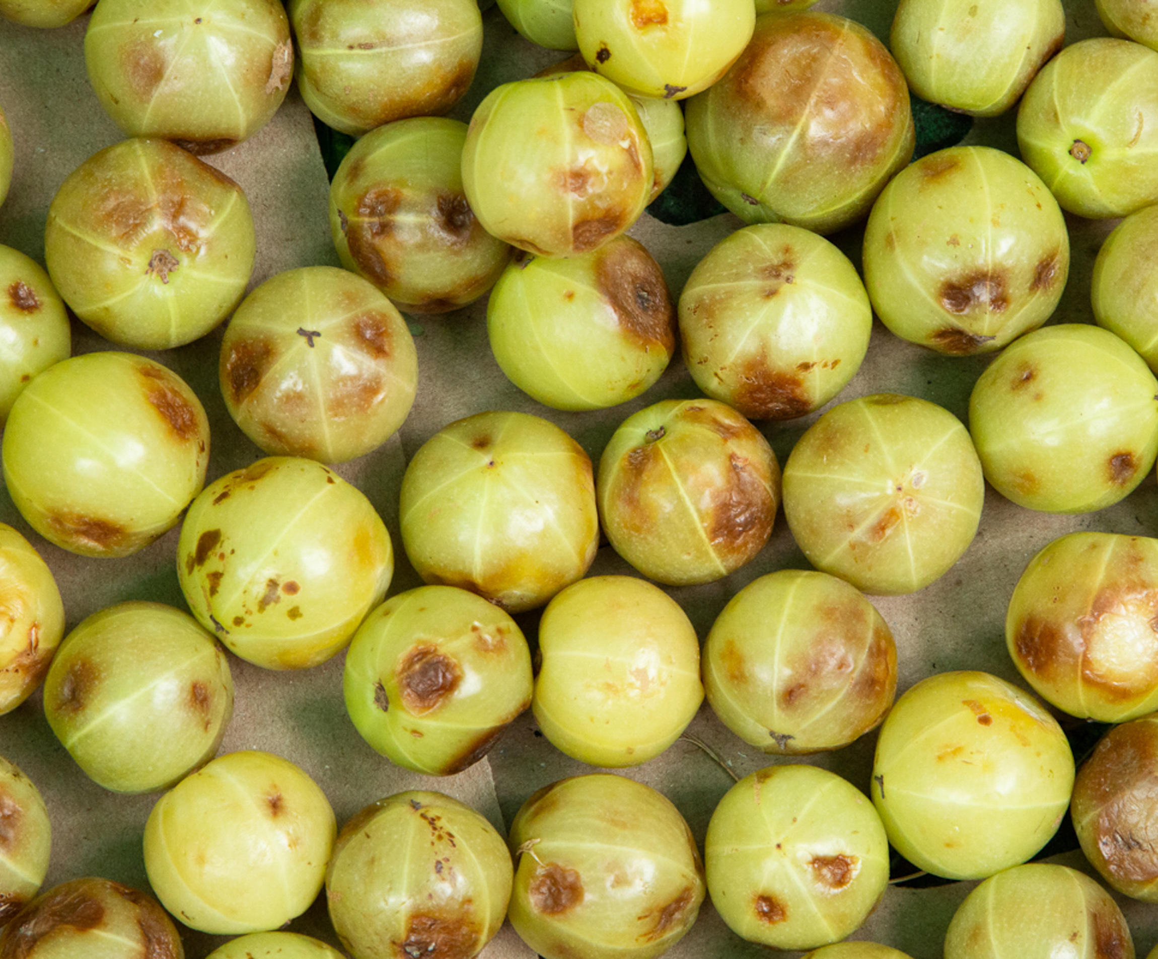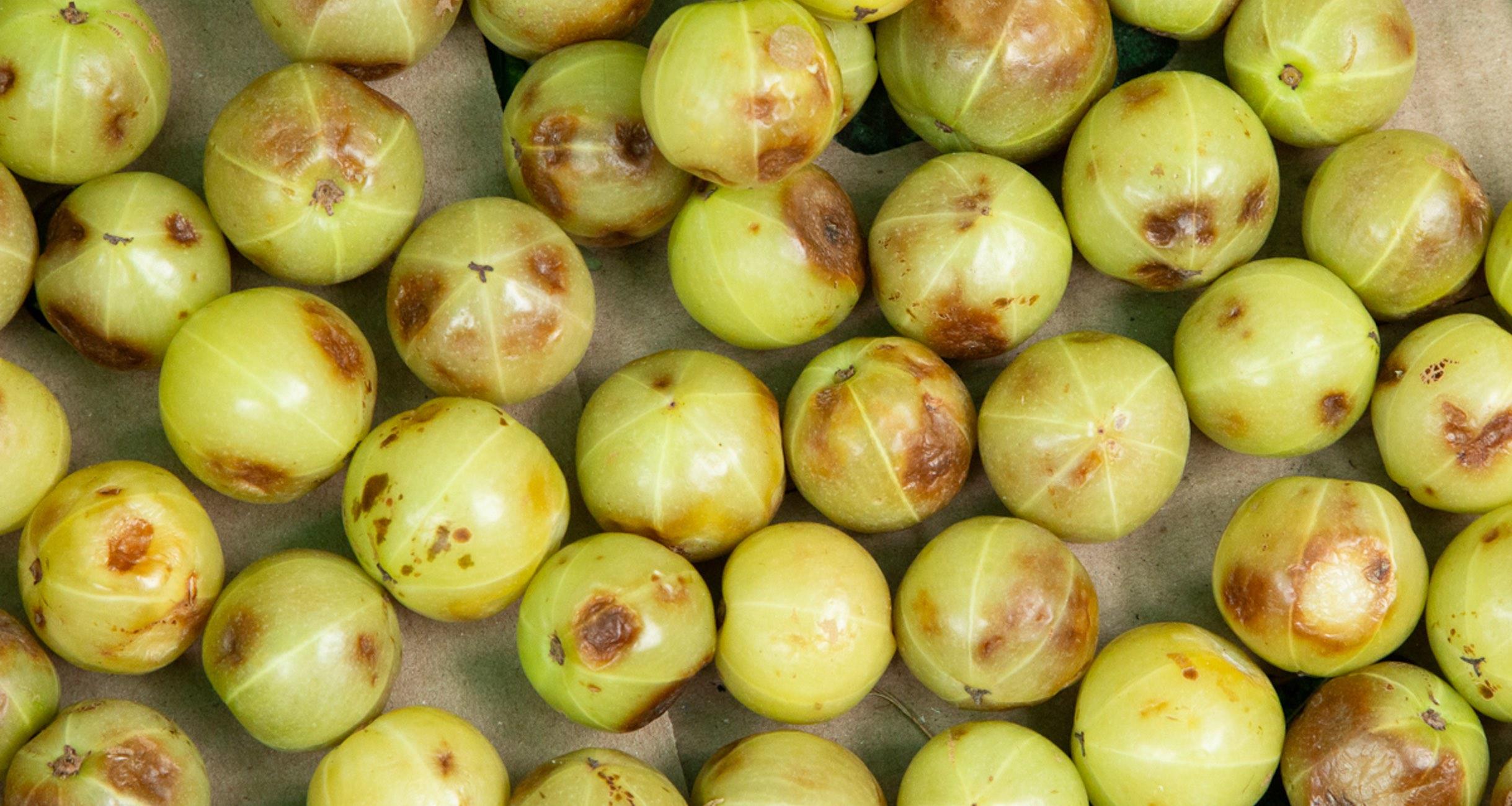 店の外には、段ボール箱の中に見たことのない野菜やフルーツが。“ドラムスティック”という、南インドのスープ仕立ての野菜カレー“サンバル”に使う野菜も無造作に突っ込まれている。そして、もうひとつ、私たち取材チームがロックオンされたのが、“アムラ”だ。ピンポン玉大の淡い緑色をした実で、インド、バングラディシュ、ネパール、パキスタンなどの国で採れるという。100g120円とこちらもお安いのだが、調べてみたら、“アムラ”は若返りの実らしいのだ。抗酸化作用があり、美肌効果も抜群だとか。今の私に一番必要なものじゃないか!そんなことも知らず、恐る恐る齧ってみると、酸っぱ――――――――――――い!悶絶するほど酸っぱいのだ!そして、ちょっぴりエグい......。