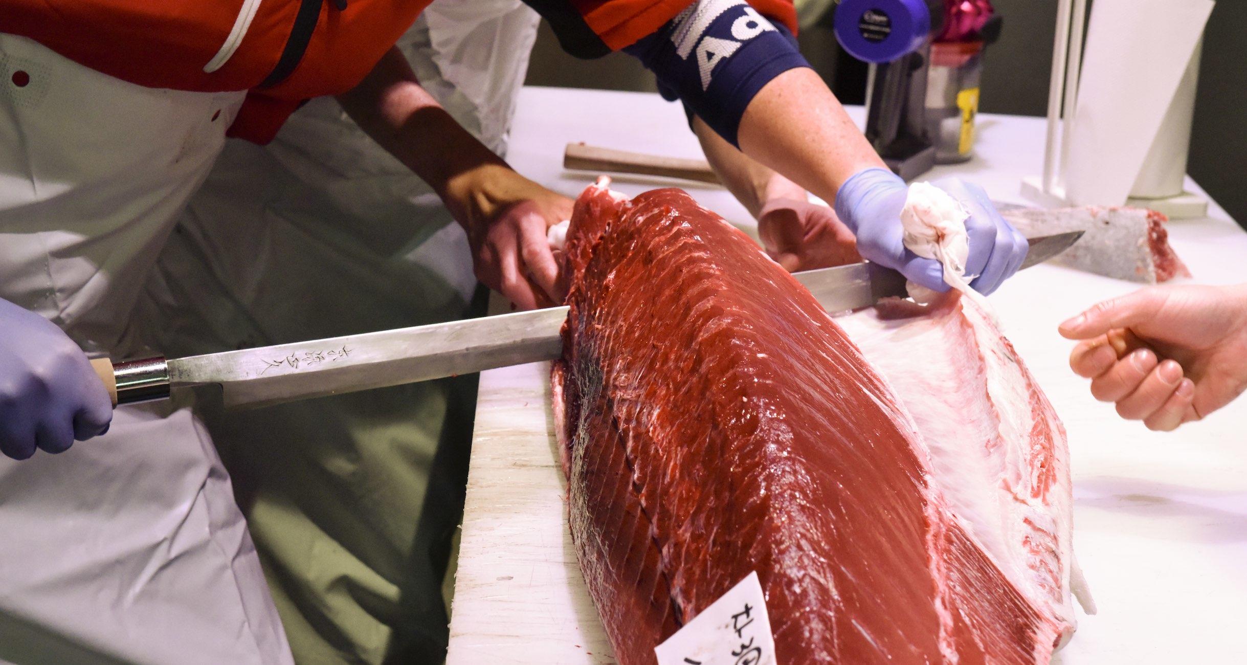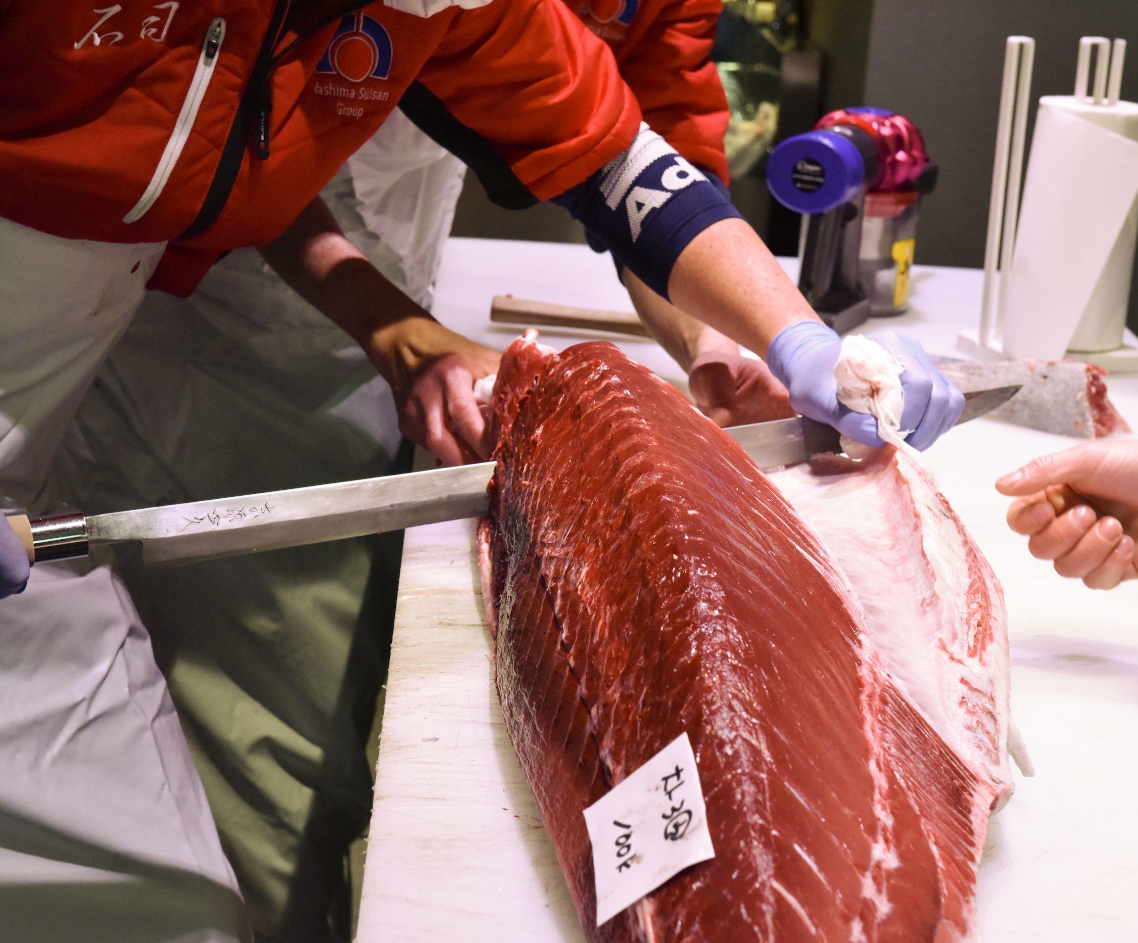 中島さんは迷うことなく一気に包丁を滑りこませる。最後は両脇のふたりがわずかにマグロの身を持ち上げ、身と俎板台の間に空間をつくり、硬いマグロの皮を断つ。