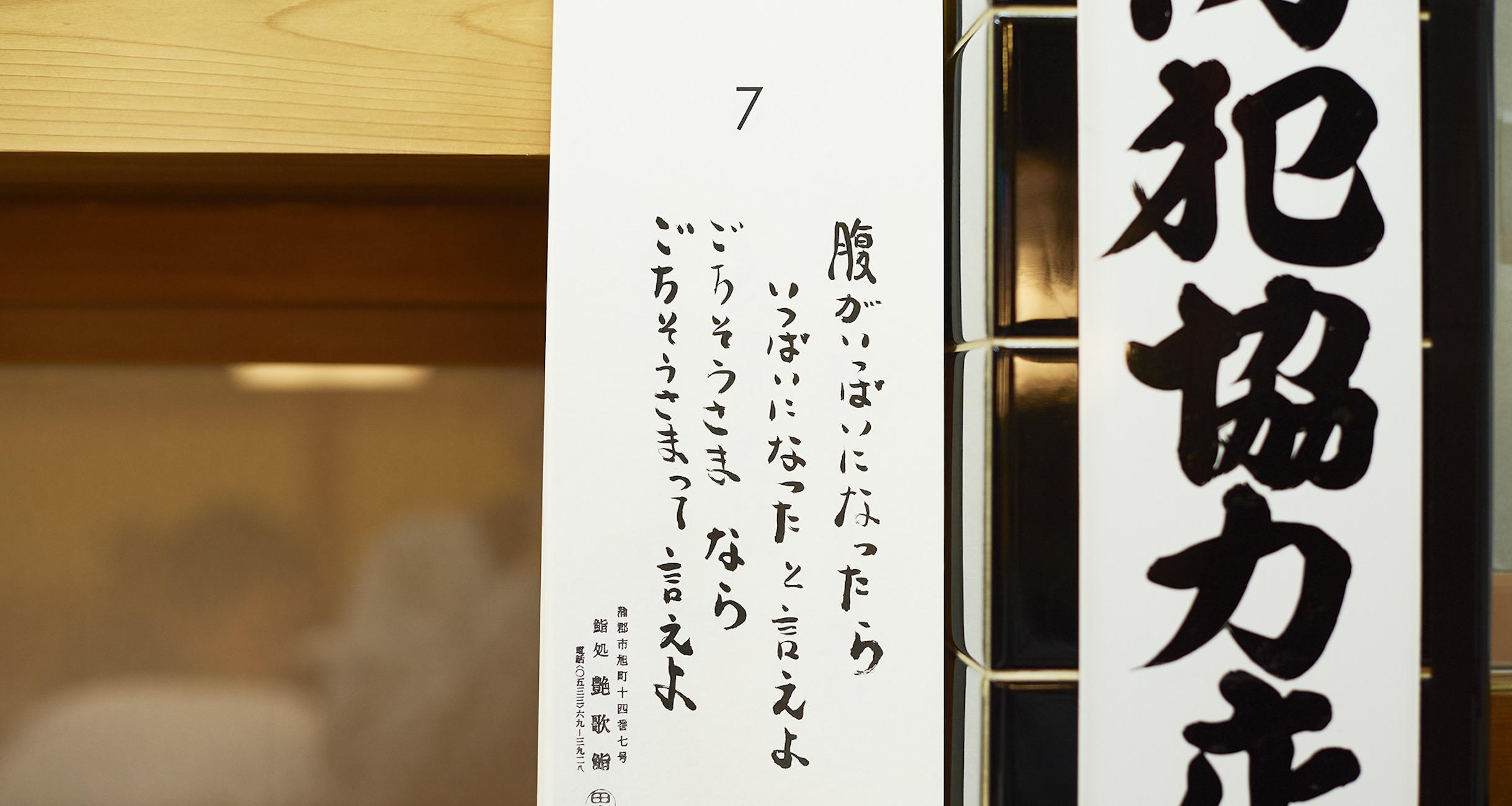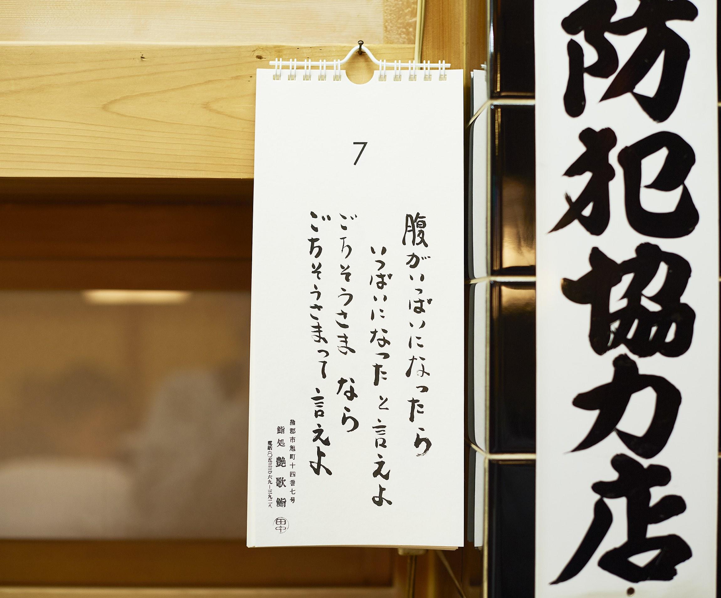 蒲郡では名の知れた「艶歌鮨」。一代で築き上げて、もうすぐ50年。歴史がある。暖簾をくぐるには、それなりの予算が必要だ。三河湾の魚介を揃えている。高級店としての矜持がある。店に入ったら、まず見てほしい。壁にかかる大将の田中実さんがしたためた名言が踊る日めくりカレンダーを。含蓄がある。第1回目は「艶歌鮨」の愉しみ方を。
