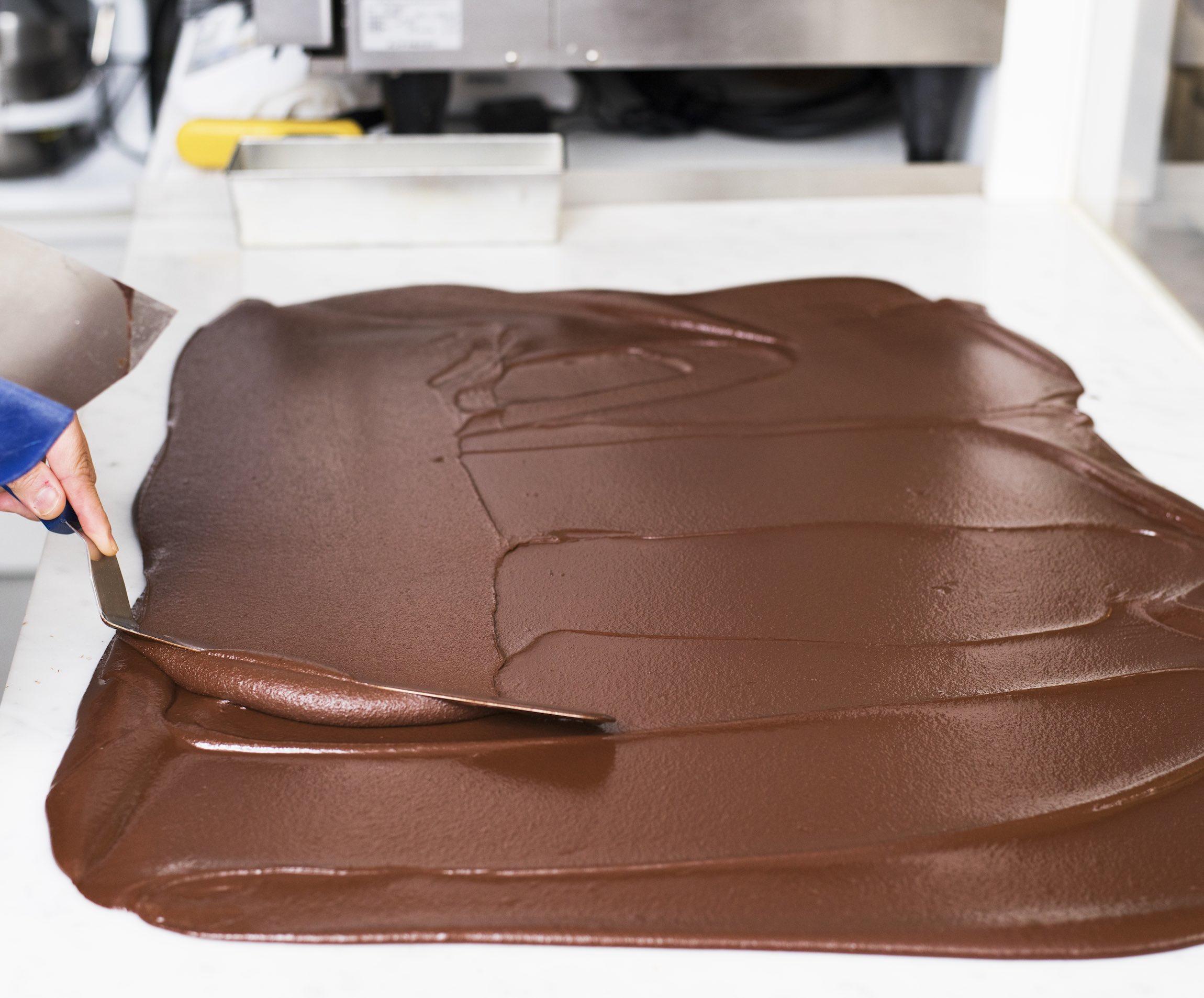 最後にテンパリングをして、結晶構造を整えます。チョコレートの温度を50度程度にあげて、急激に冷ますことで、安定した結晶構造を充分に形成し、溶けにくくてツヤのあるチョコレートに仕上がります。