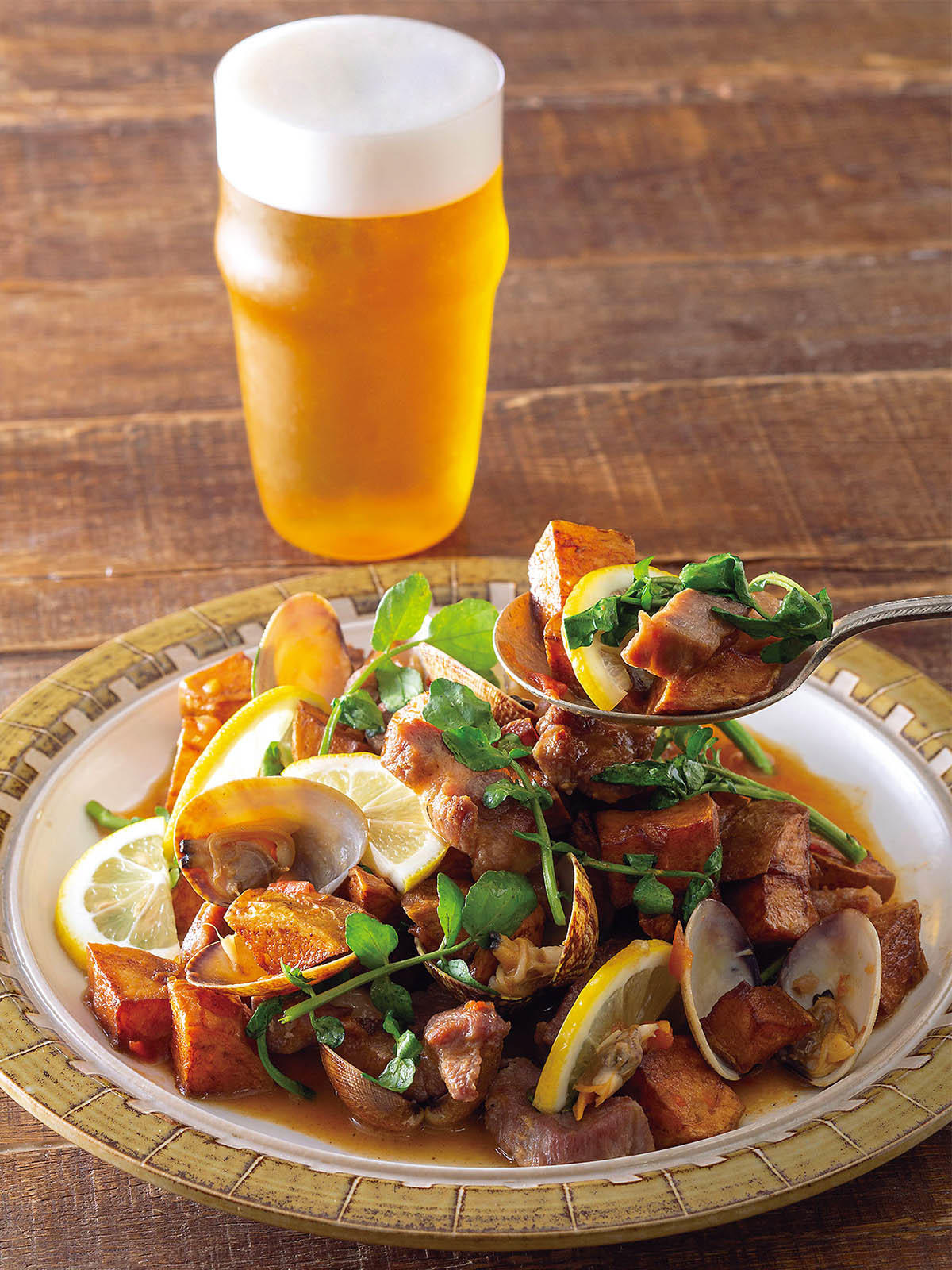 “豚肉とアサリの蒸し焼き ポルトガル風” 豚肉と貝、トマトの旨味がたっぷり。仕上げのレモンとクレソンが爽やかで、リッチな味わいの「クリアアサヒ プライムリッチ」と響き合う一品だ。