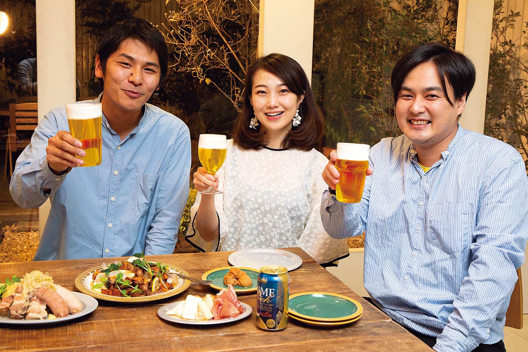 プライムリッチと愉しむ持ち寄りパーティーに集まった3人。右から、料理家の山田英季さん、ライターの崎谷実穂さん、クリエイティブプロデューサーの竹内順平さん。