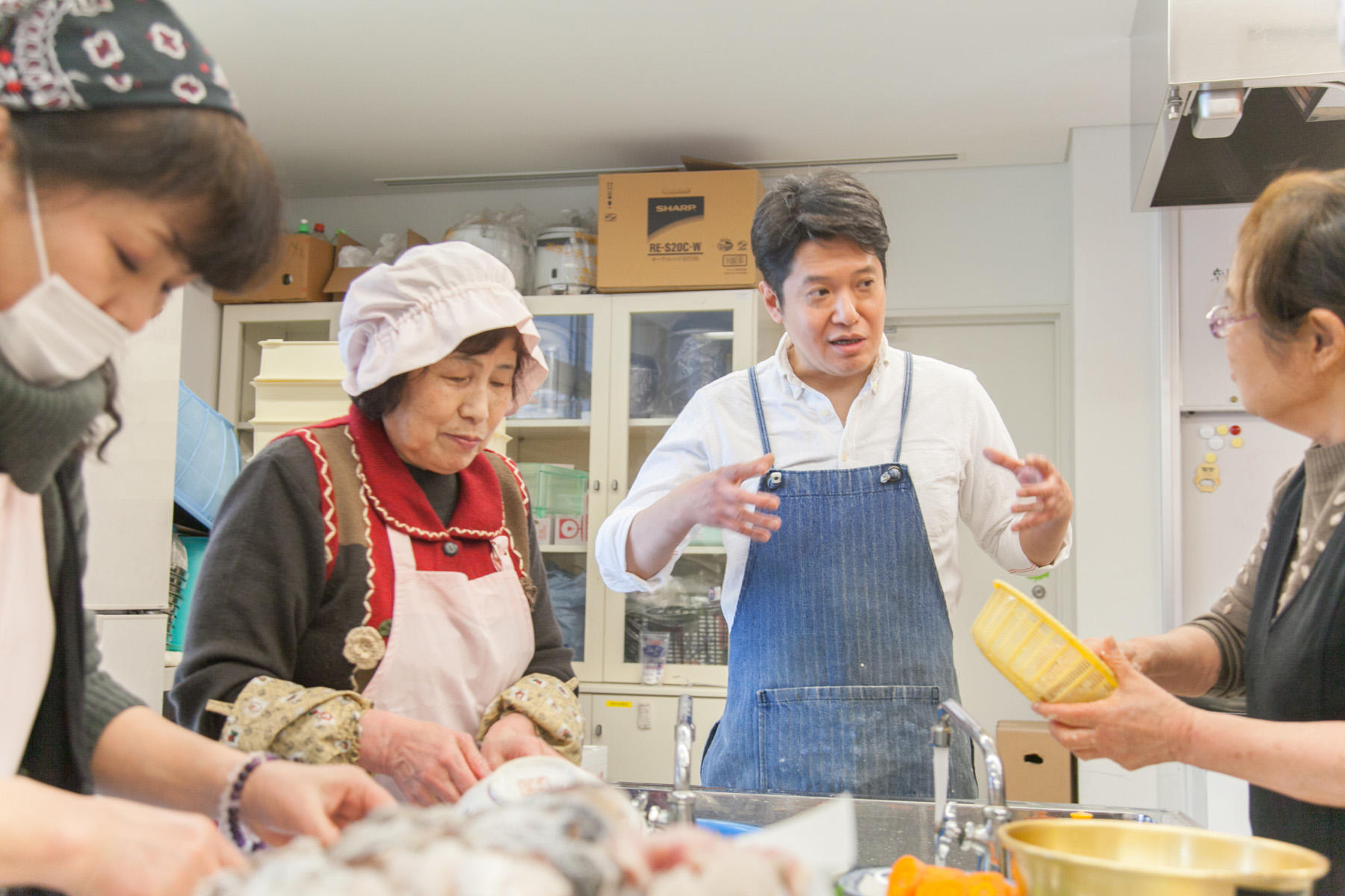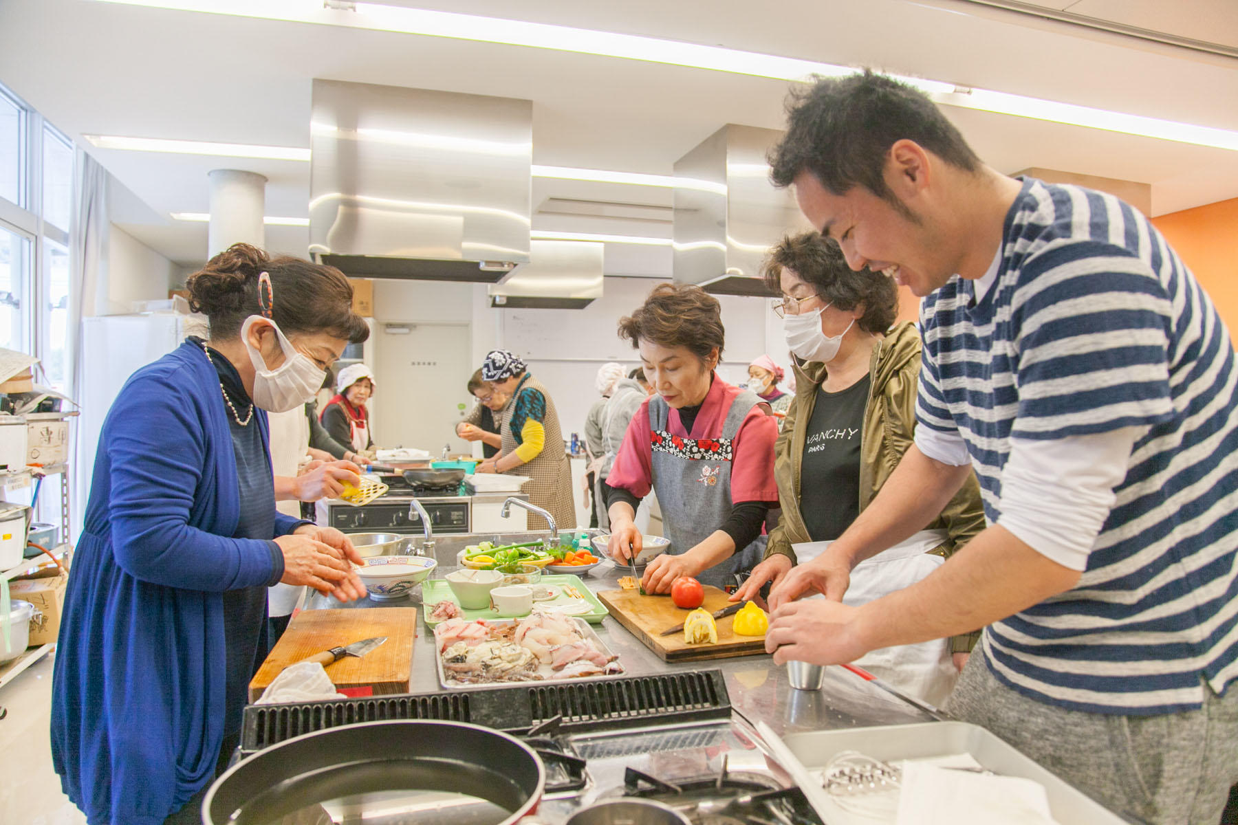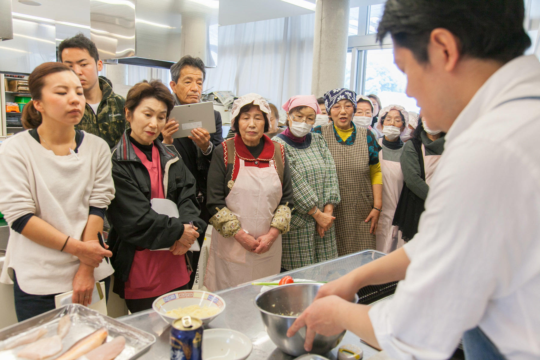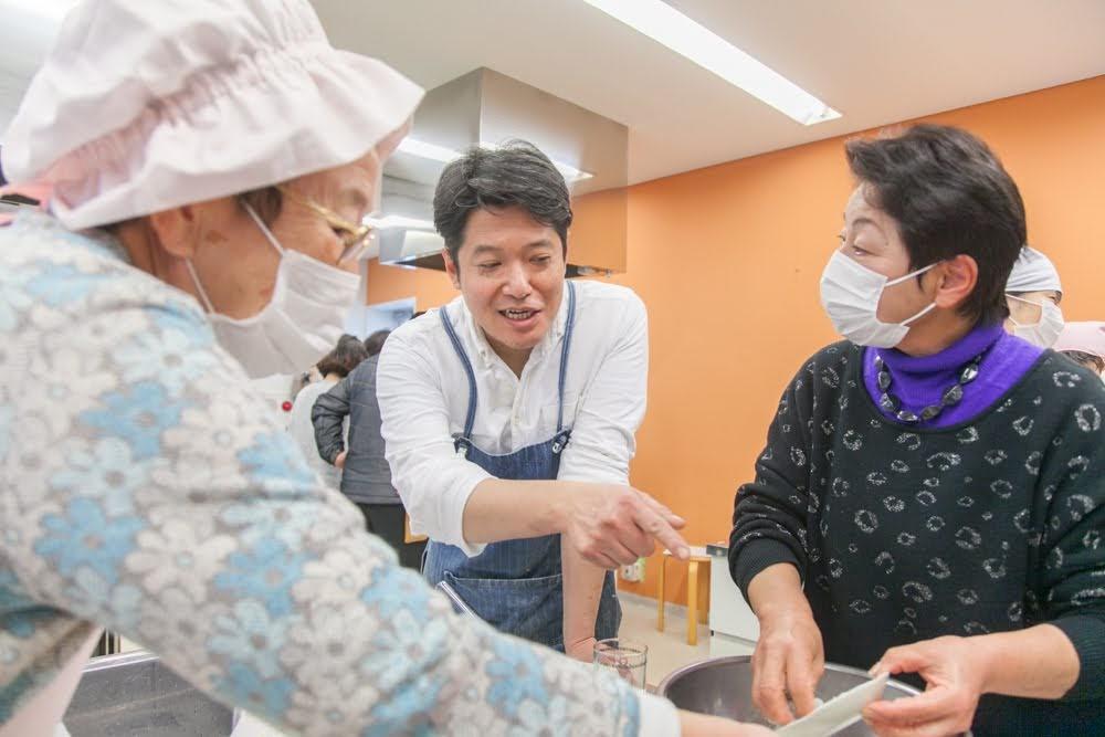 気持ちよく晴れた朝、倉橋町の中心、まちづくりセンターの調理室に地元の方々が続々とやってきた。新しい名物料理を観光客誘致の目玉にするためには、まずは島の飲食店や家庭でつくってもらわねば始まらない。今日は、名物のお披露目会を兼ねた料理教室なのだ。