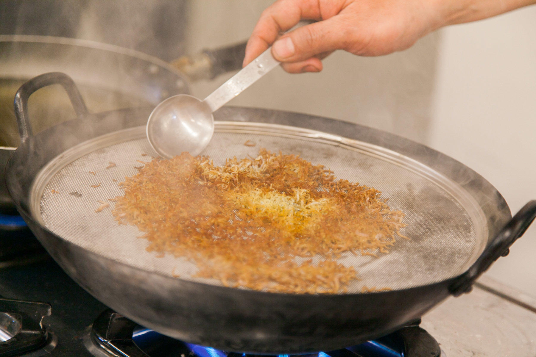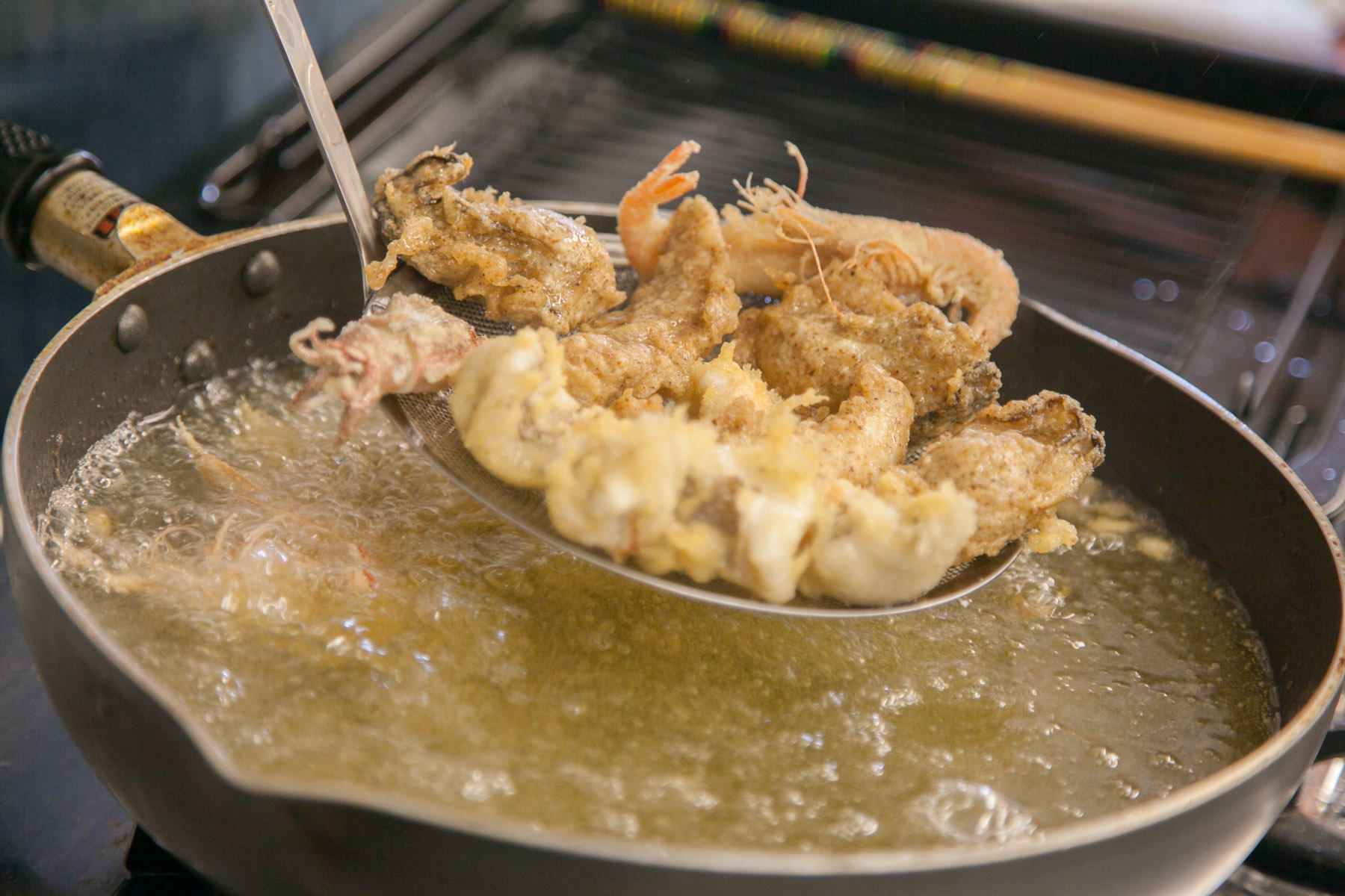 「さあ、今から皆さんにもつくってもらいます。おいしくつくるコツは、二度揚げです。高温の油に入れたら途中で引き上げて、余熱で火を通してからもう一度揚げる。魚も野菜も季節次第、倉橋にそのとき"あるもの"で大丈夫ですからね」