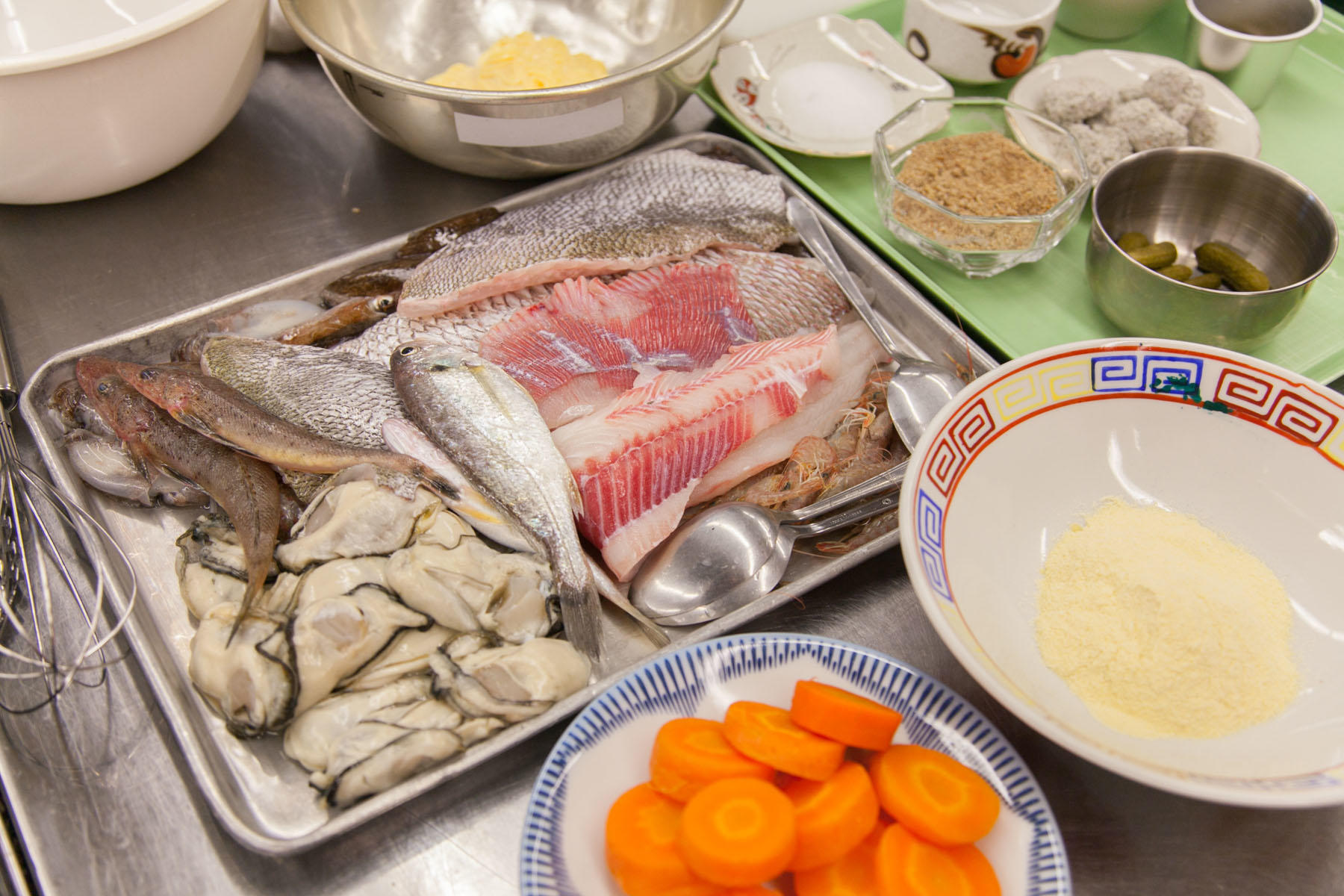 6つの調理テーブルに配られた大きなトレーには、牡蠣のほかホシザメやヒゲソリダイ、トラギス、ネゴチなど聞き慣れない名前の魚がさまざま、それに小さなイカやエビ、人参やハーブ類、緑色の摘果トマトが並ぶ。