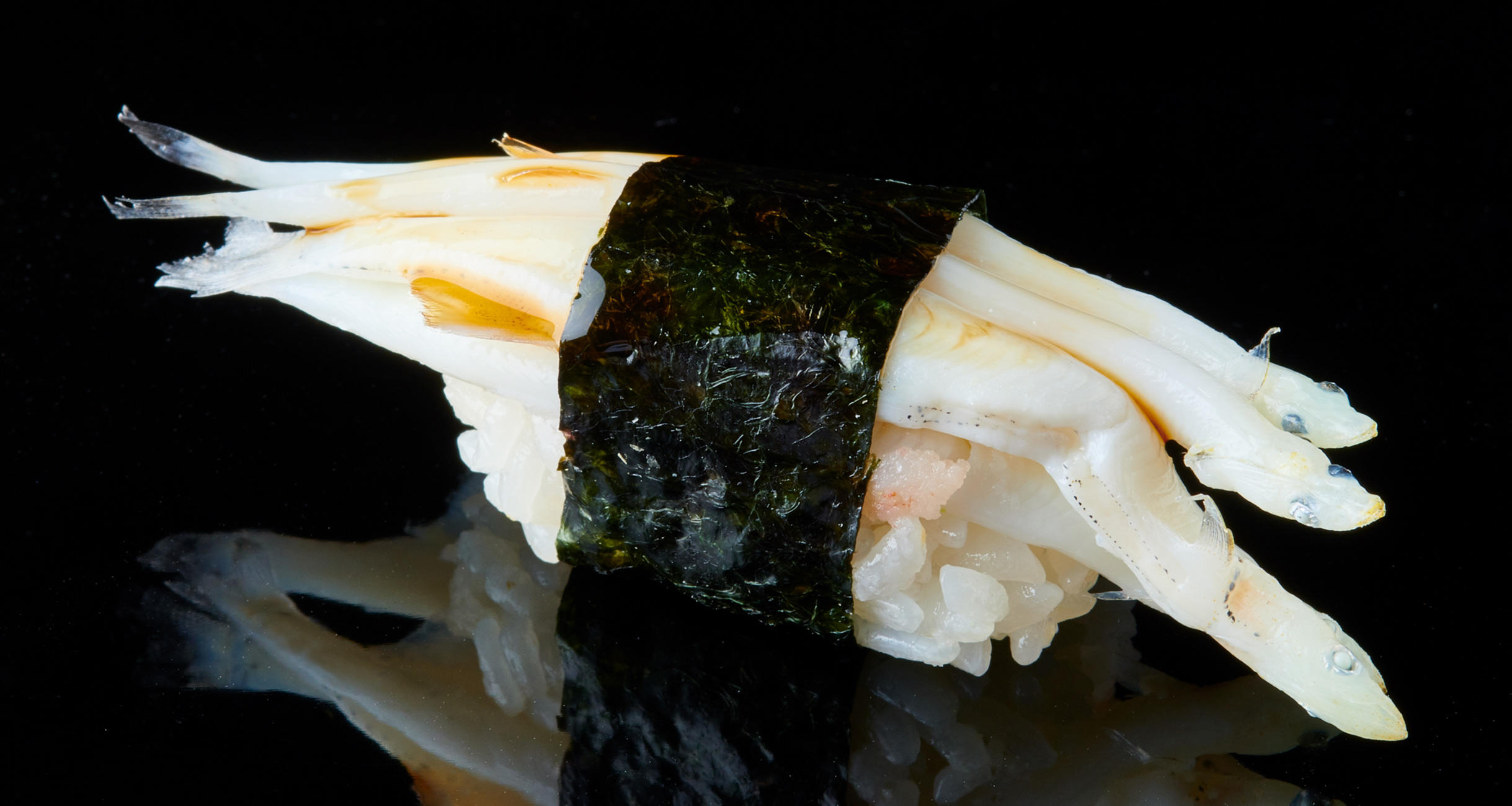 「白魚は型が大きくないと価値がないのです。市場には晩秋あたりから並びますが、出始めの白魚は4、5cmしかありません。握りには10cm前後のものを厳選してお出しします。といっても時季は4月いっぱいが限界です。この時季の白魚はお腹に卵を抱いていて、熱を加えるとプチプチとした食感になって楽しいものです」