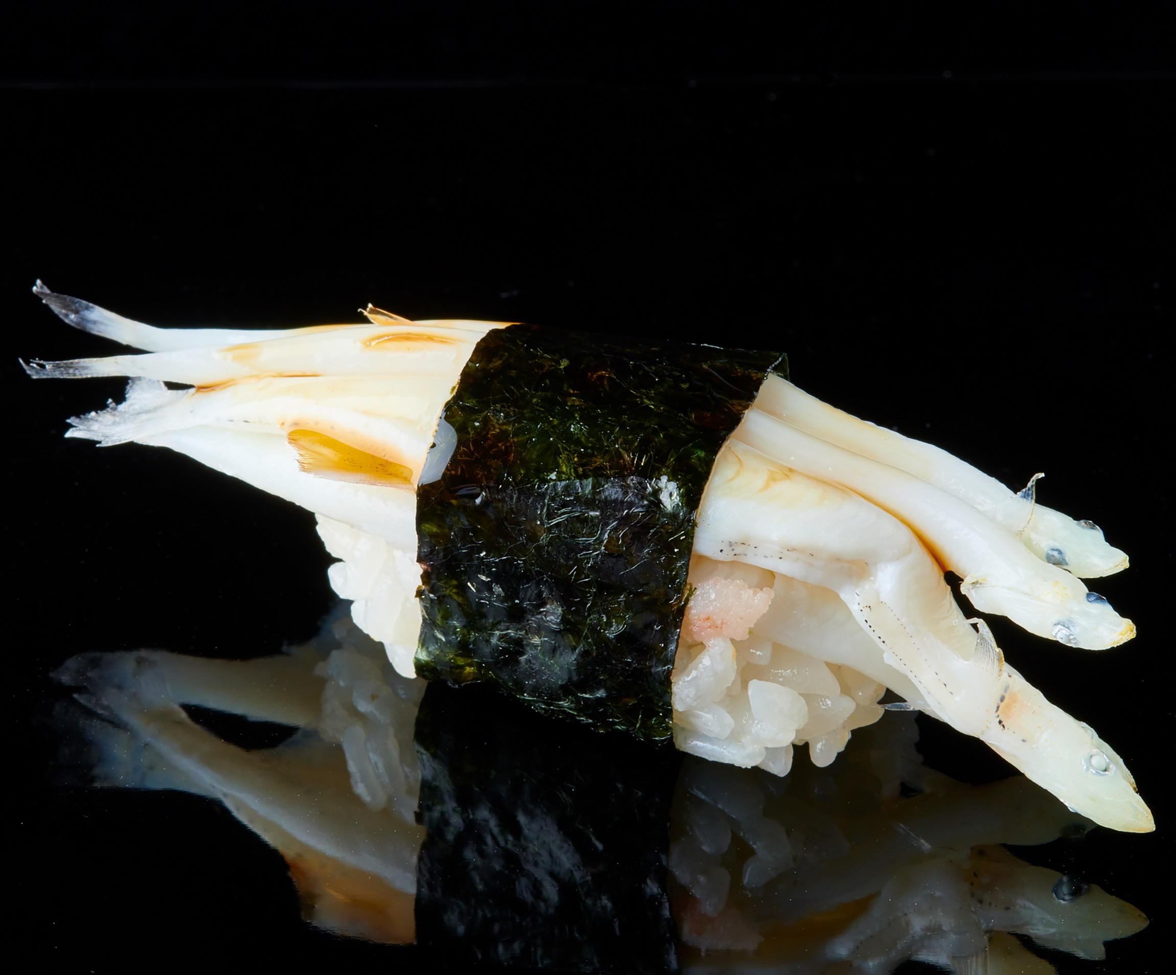 先代は蒸した白魚に江戸前伝統の自慢の芝海老のおぼろをかませ、数匹の白魚を、川を上る筏に見立てて握った。四代目・油井一浩さんは、この白魚の握りを先代から引き継いだ。