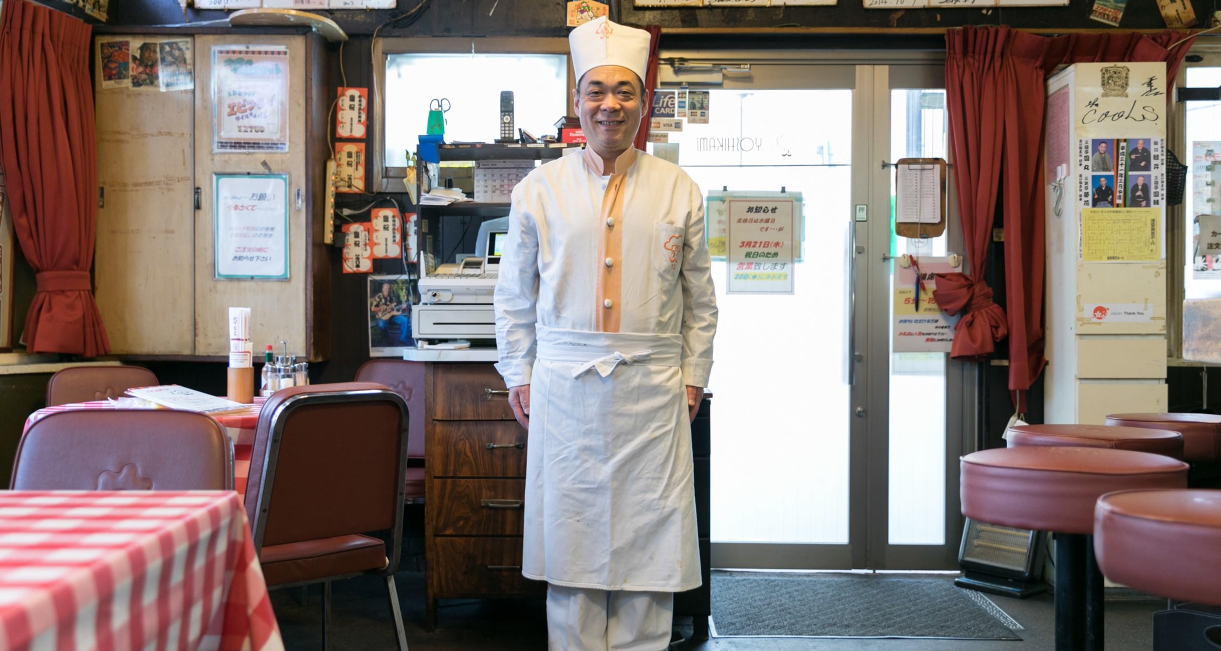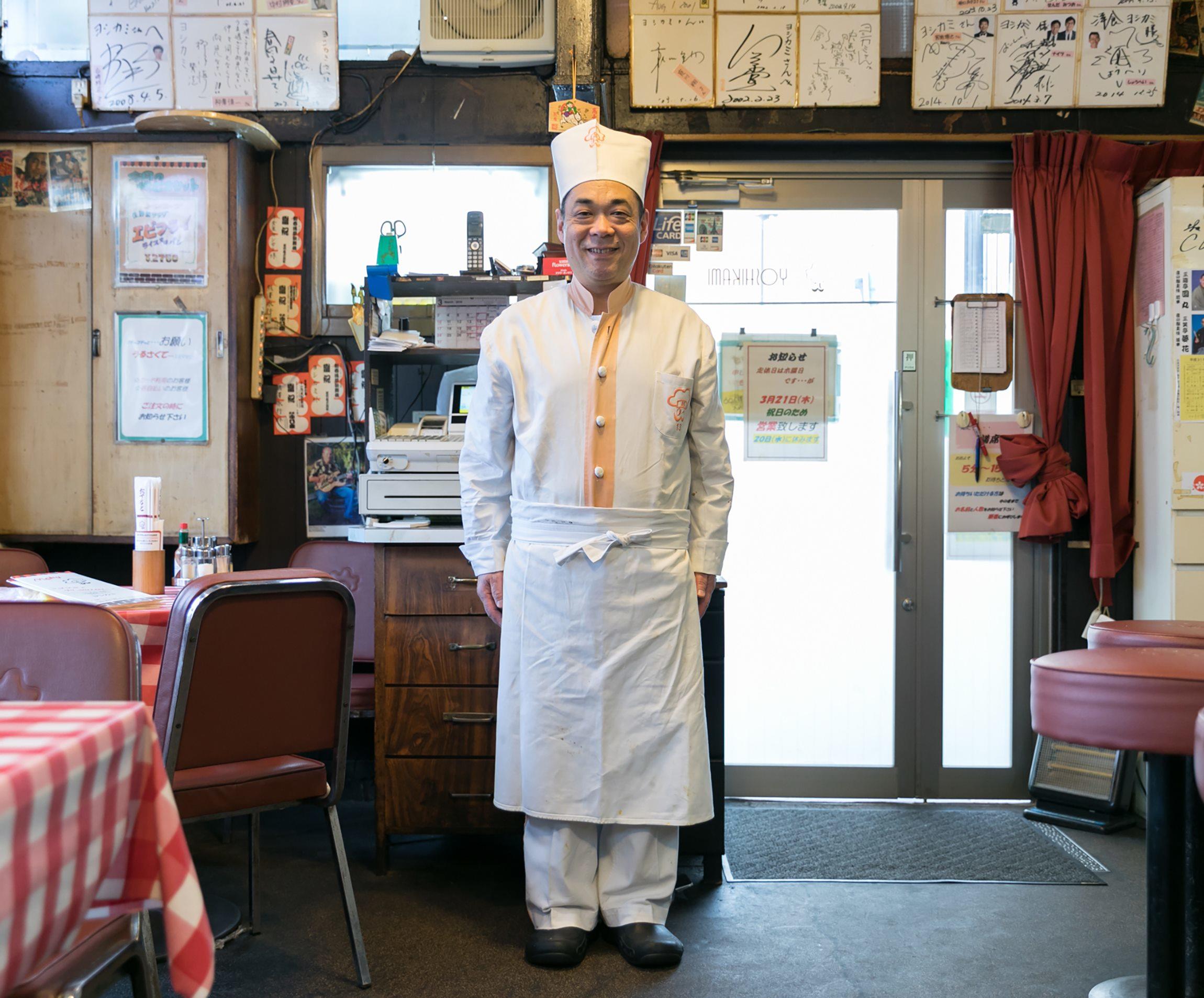 コックコートの襟とボタンの部分にオレンジ色の縦ラインが入り、胸元とコック帽には店のトレードマークである口髭のあるコックさんのイラスト入り。このイラストに名前はないそうだが、「みんな“ヨシカミちゃん”って呼ぶね。浅草の人って、仲良くなると“ちゃん付け”で呼ぶんだよ」とは、店長の吾妻弘章さん。