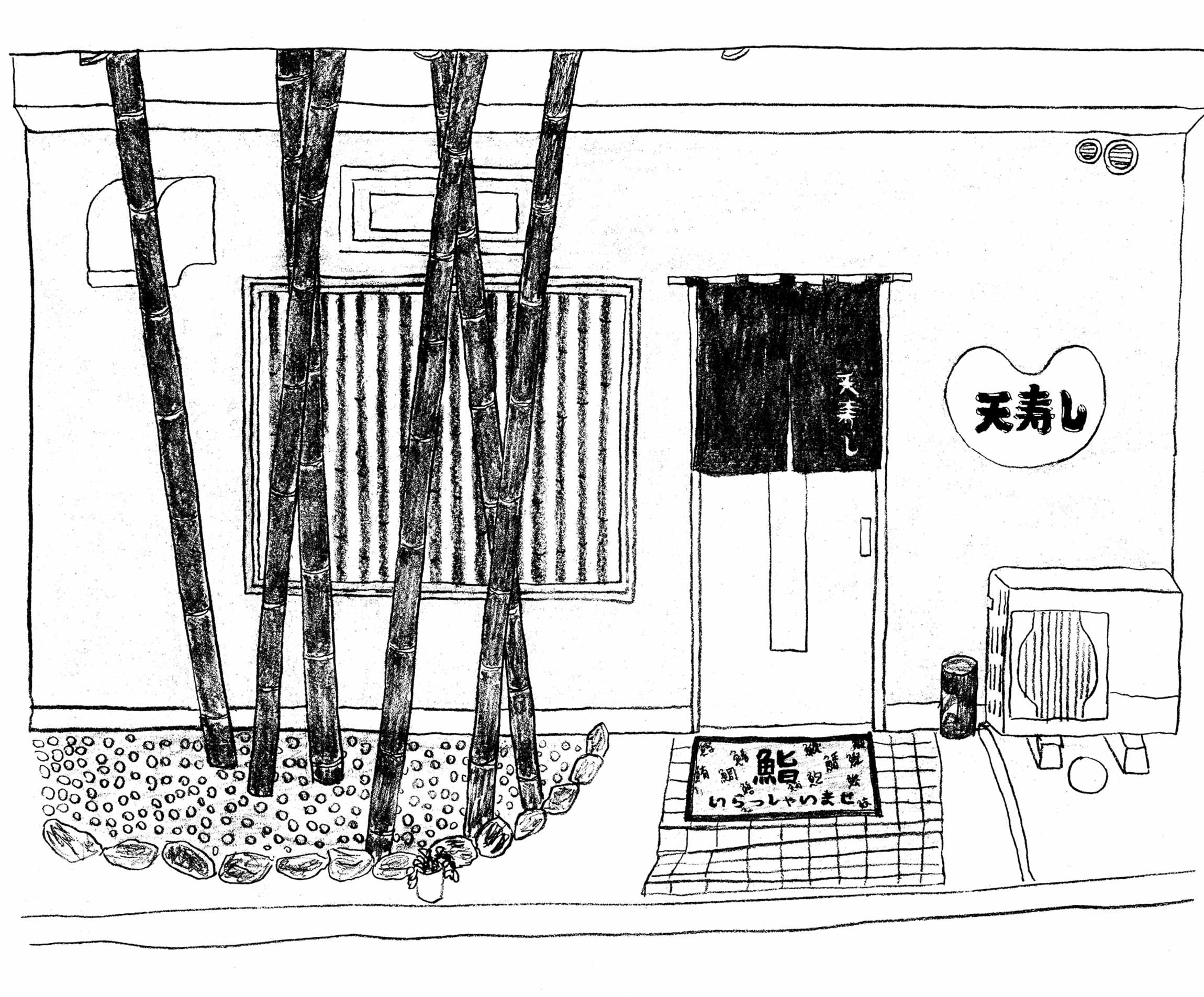 あっという間に着いた「天寿し」は、駅から目と鼻の先にありながら横道に入って目立たない、好ましい場所にあった。空豆色の暖簾も、空豆のような形の看板も、それに書かれた毛筆の文字も、毛筆書きの筆致も溌剌(はつらつ)としている。