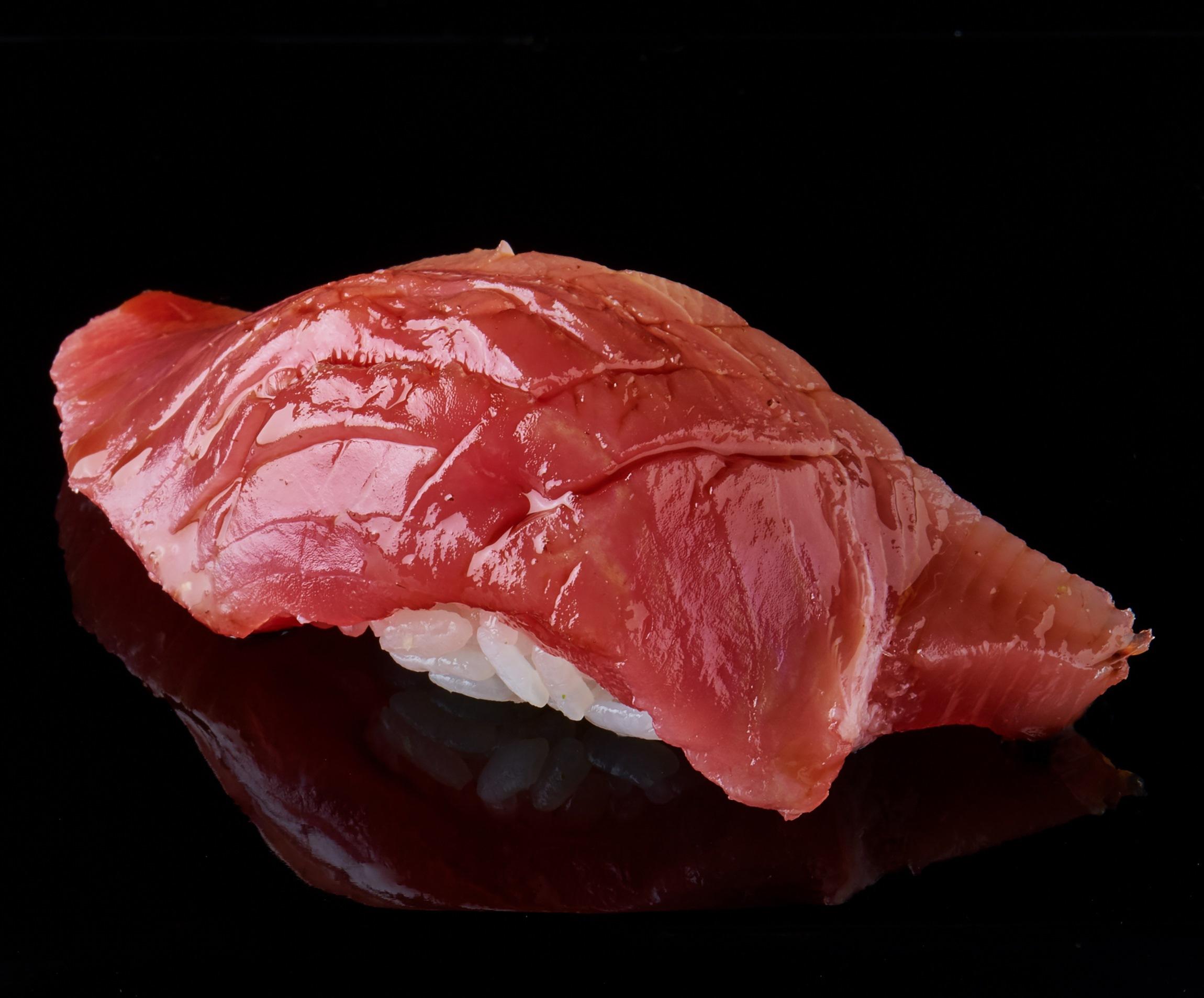 「㐂寿司」ではマグロは「背」を使うのが流儀だが、鰹は魚の状態によって「腹」と「背」の部位を使いわける。本来、東京では鰹を炙って「たたき」にする慣習はなかった。ただ、「㐂寿司」では魚によっては串を打って皮目の部分だけに遠火の強火に当て炙ることもある。