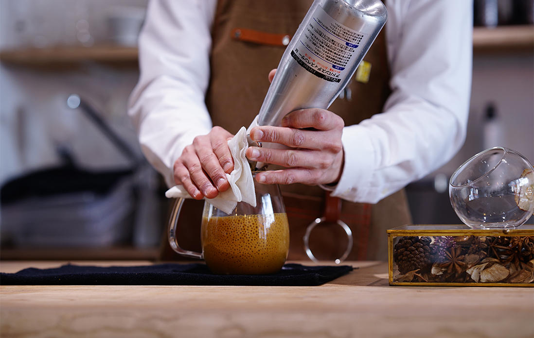 海外では圧倒的な人気を誇る定番カクテル、ネグローニである。豆はエチオピア産の“グジ”。そのつくり方は、「フラッシュインフュージョン」という瞬間的に香り付けをする、バリスタらしいアプローチだった。