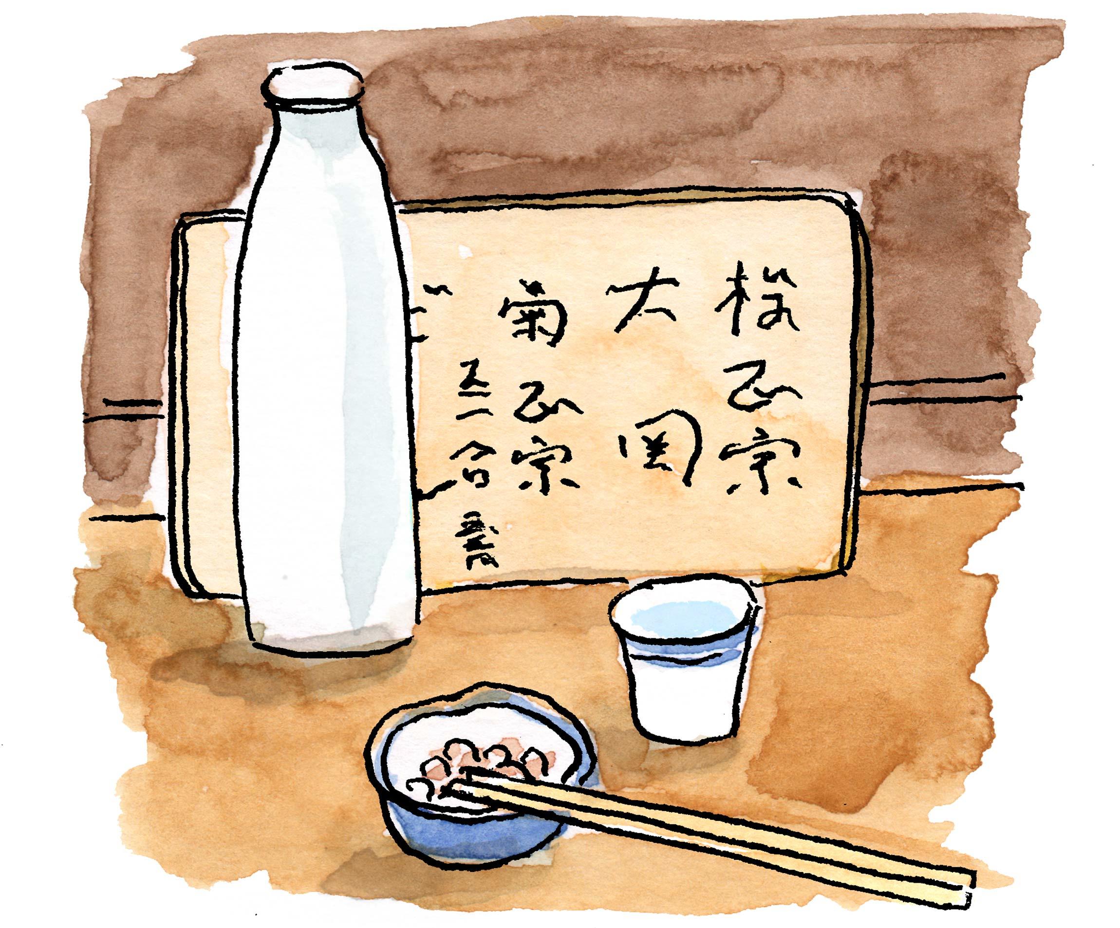 菊正宗を2合、燗でもらう。酒の揃えは菊正宗、櫻正宗、大関の3種で、一升瓶から正1合入る柄のついた枡に受け、それを徳利に移す。