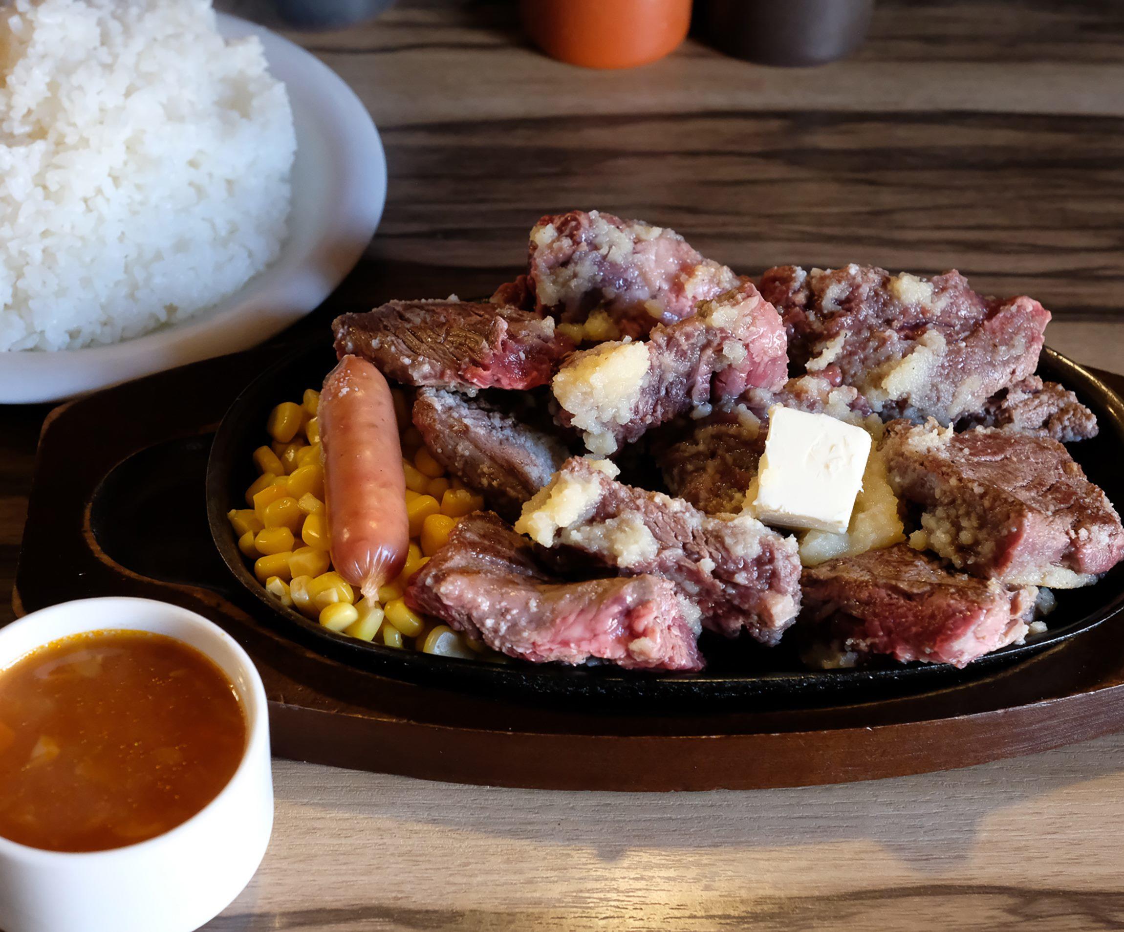 メインメニューはステーキとハンバーグ。一番人気の”デンジャーステーキ”は食べやすいふた口サイズに切り分けられ、バターと、お好みでおろしニンニクを絡めることができる。これをテリヤキ、甘口、辛口、ゴマ味噌、青じそ、ホットチリの6つのソースやわさび醤油で食べる。いくつかのソースを好きにブレンドするのもまたうまい。