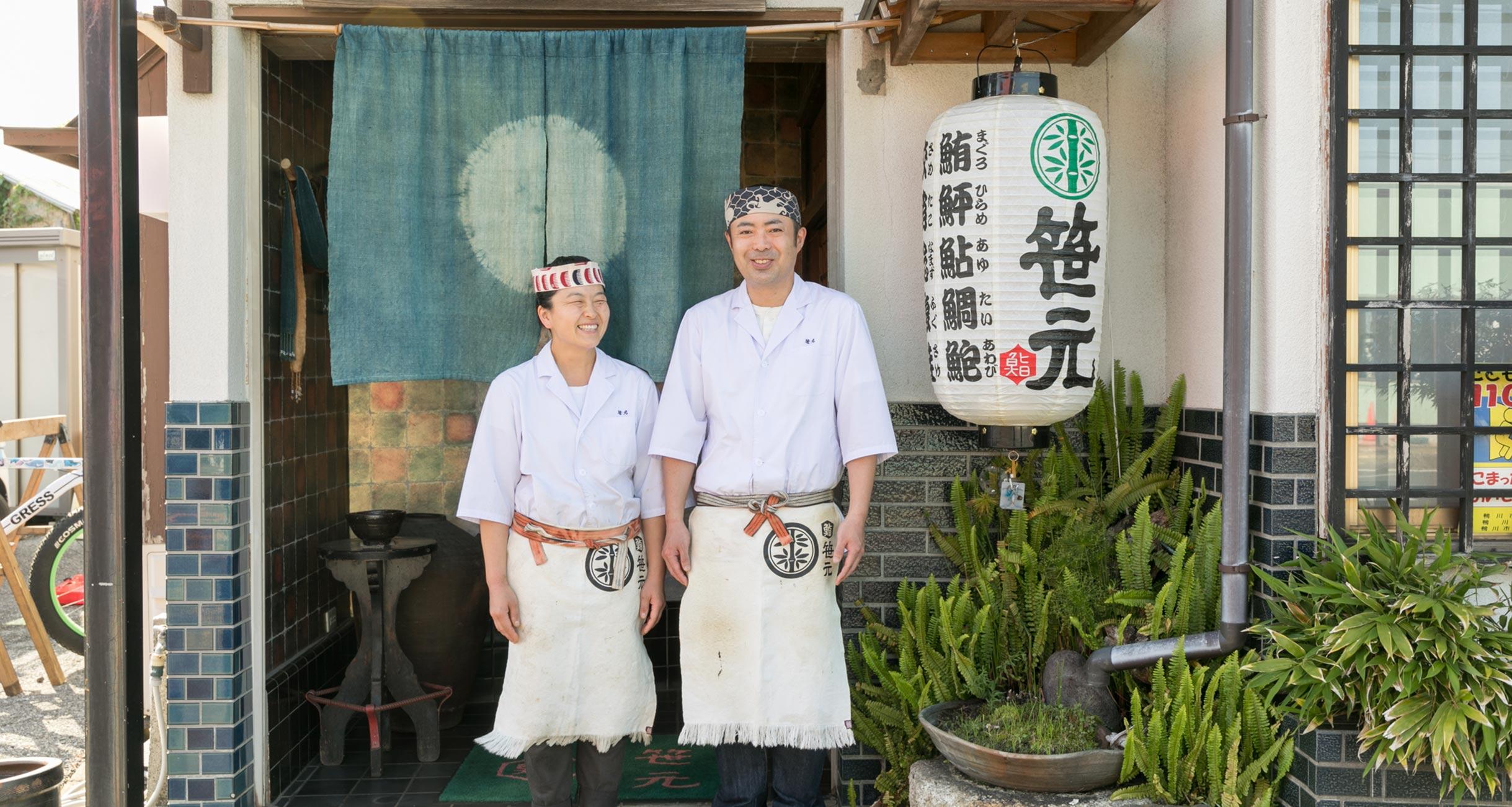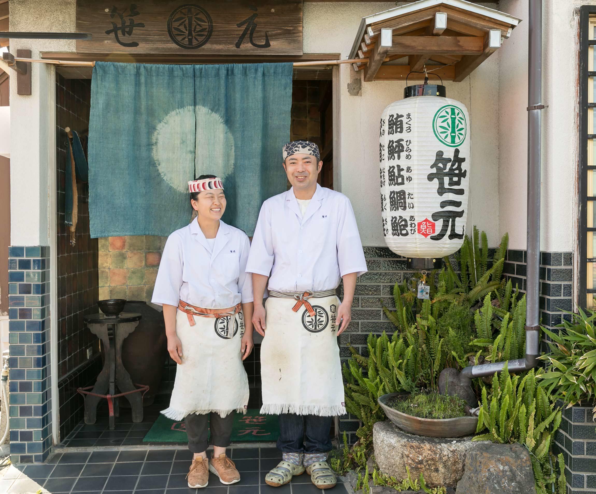 明るく朗らかな二代目夫婦が板場に立つ、千葉は鴨川の「鮨 笹元」。朝から晩まで“24時間一緒”というふたりにとって、鉢巻(ハチマキ)は、オンとオフを切り替えるための大切なスイッチだ。