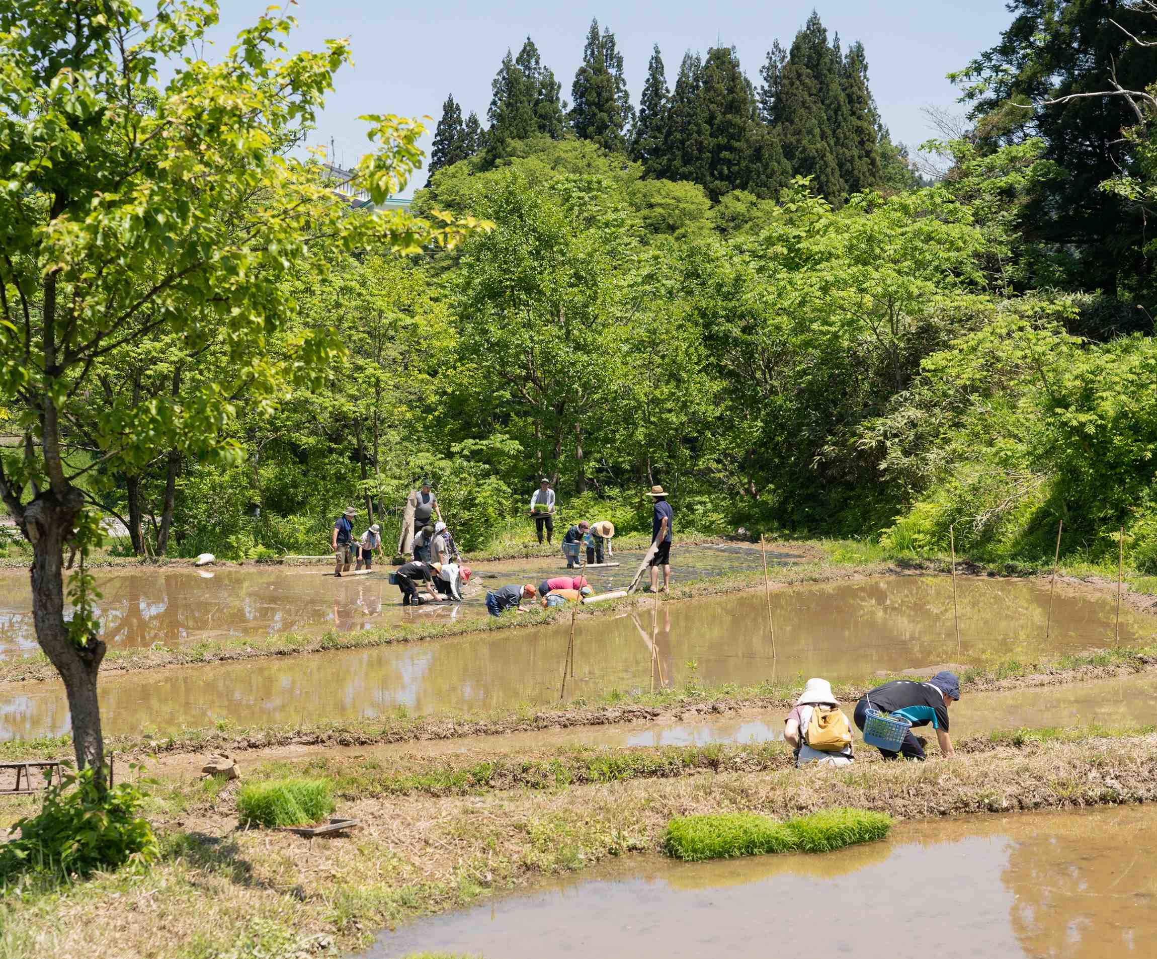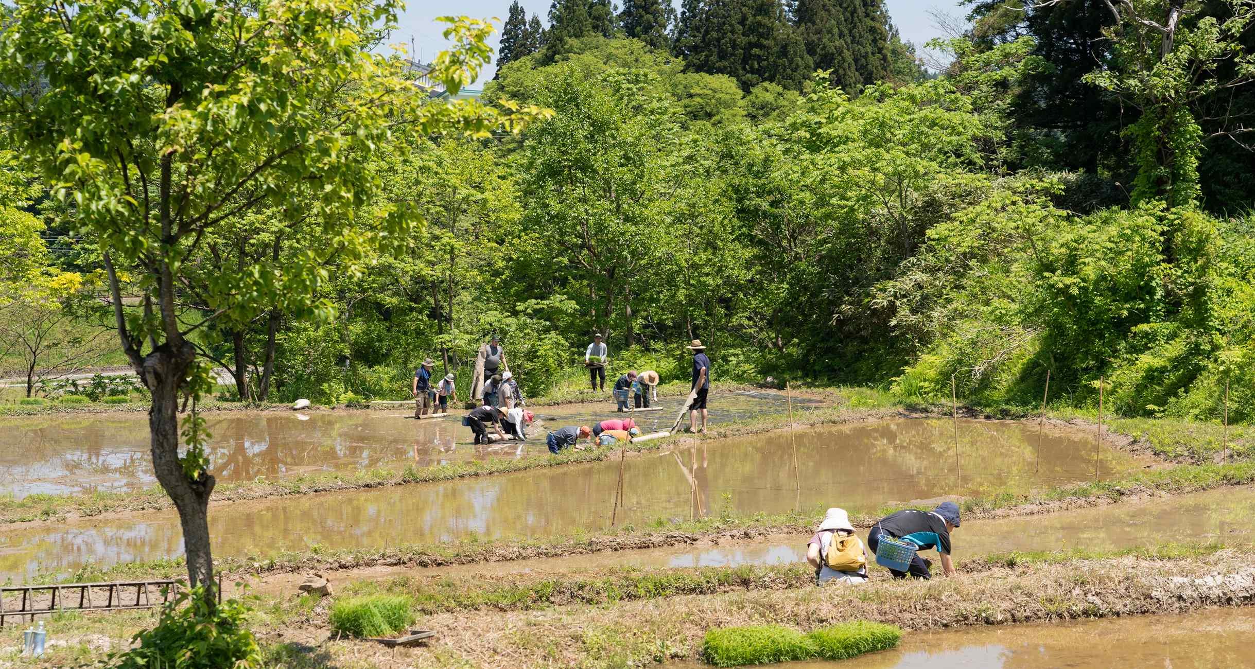 「休んで麦茶を飲んでください」と畦道から声がかかった。そろそろ正午だ。気づくと、田んぼに入って熱心に働いていた人たちが、ずいぶん減っている。みんな日陰に入って、ひと休みしていた。