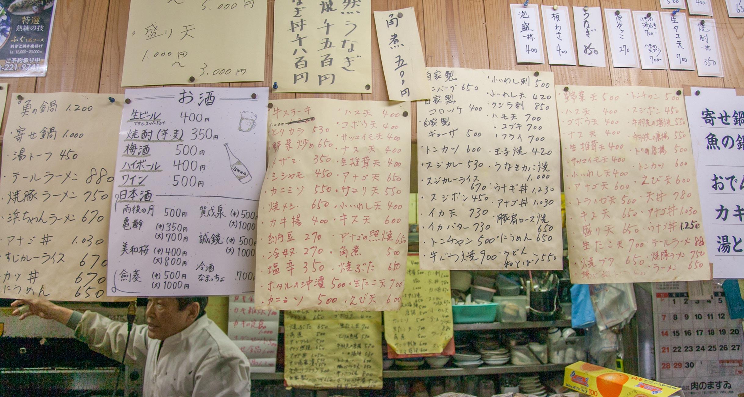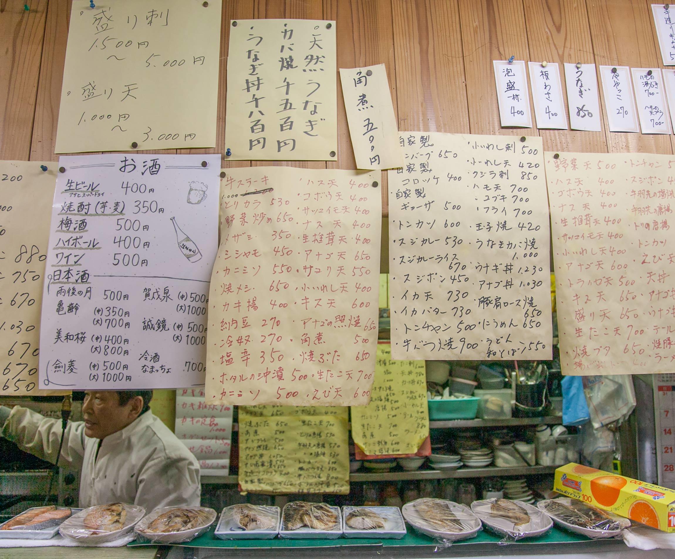 狭い入口は、都会のダンジョンの様相で昼でも薄暗い通路を通っていくと、中に一軒、蛍光灯の明かりが日中でも煌煌とついていて、格子戸の四角いガラスから覗くと長いカウンターが見える。その上にずらりと惣菜が並んでいて、これが飲兵衛なら景色だけで一合はいける。思い切って引き戸をガラリと開けると、気持ちいのいい挨拶で迎えてくれる。