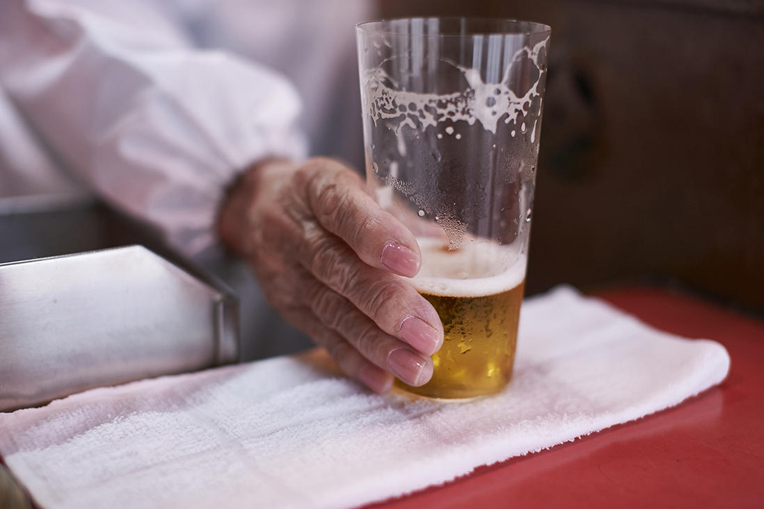 これは、まずグラスの匂いを消し、次に水臭さも消すためだ(ママは他店ではジョッキが冷蔵庫臭いので瓶ビールしか飲まないほど敏感である)。