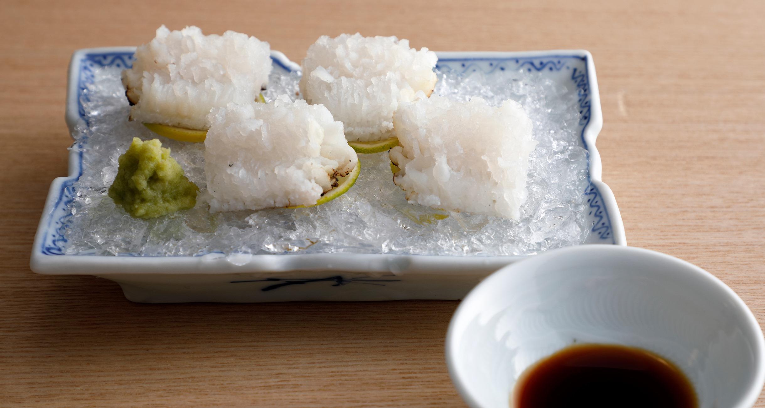 「天むす 喜多」で何より嬉しいのは、鱧を注文すると、骨切りから調理を見られること。美しく折りたたんだ長い鱧を冷蔵庫から取り出し、清潔なまな板の上で骨切りする。シャッ、シャッ、シャッ、シャッと小気味いいリズムを刻みながら鱧の身に等間隔の線がひかれていく。