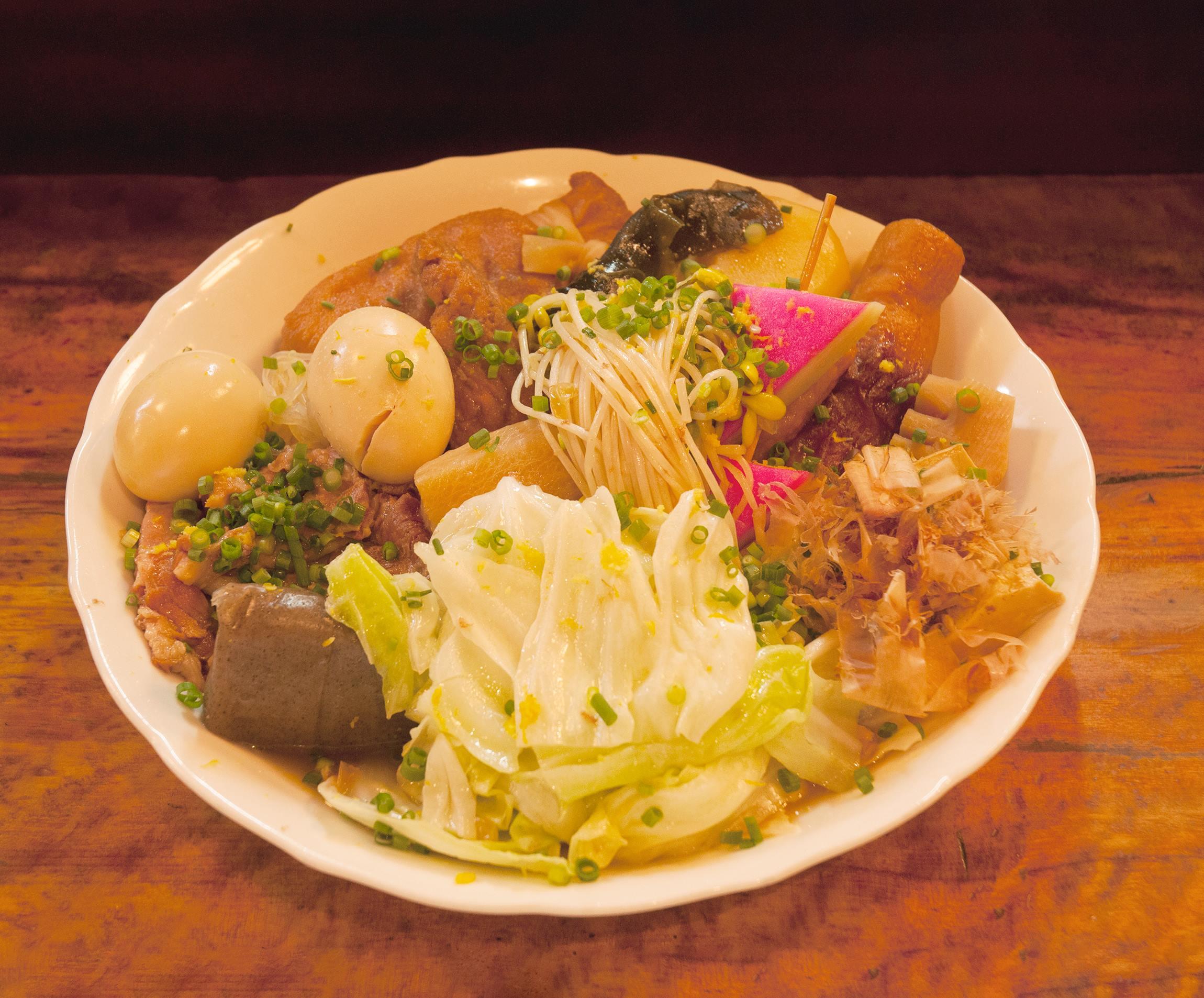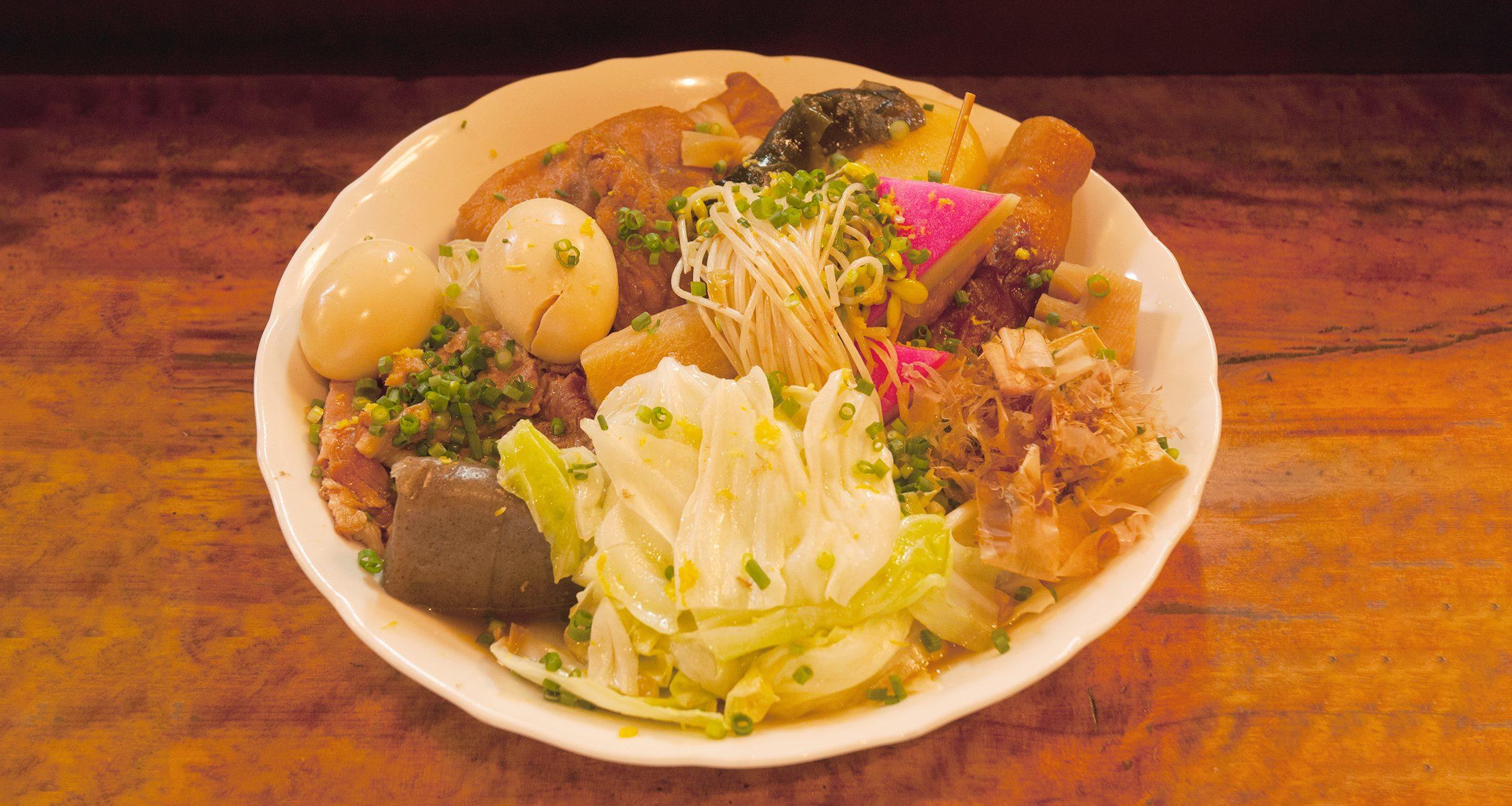 「うちのおでんの特徴は、“おやし”やキャベツといった野菜が多いこと。野菜は注文が入ったらさっと湯通しする程度に、おでんつゆにくぐらせるんです。じゃがいもは型崩れしますし、きんちゃくはとても入りきらないので同じ鍋にはいれていません。“ナンコツ”もはずせません」