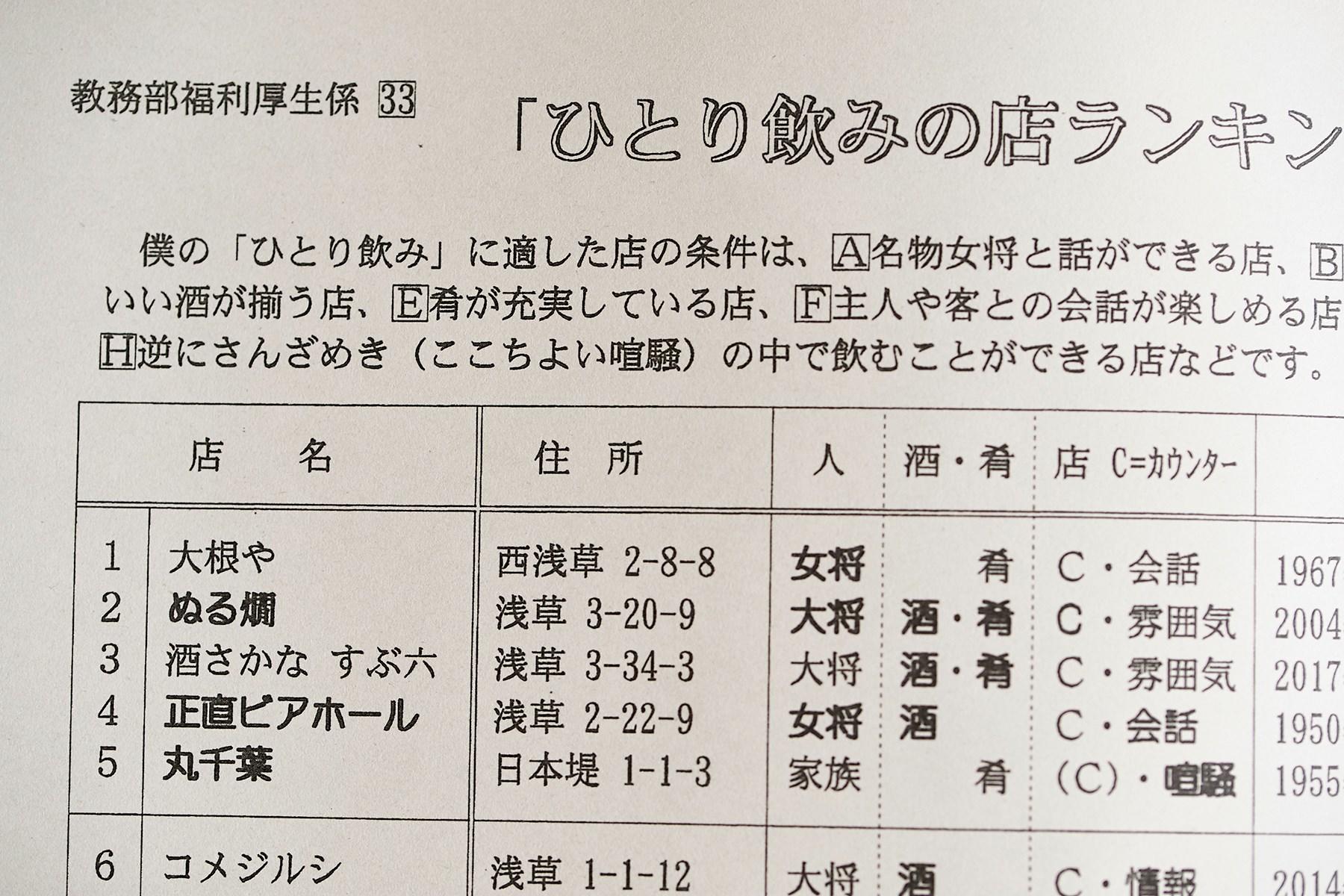 吉村氏は「平さん(へーさん)」と呼ばれ、誰からも愛されていた。浅草の裏の裏まで知り尽くした平さんが通った酒場の代表が、三ノ輪「中ざと」、ひさご通り「甘粕」、猿之助横丁「かいば屋」と「番所」(この4軒は現在閉店)、「正直ビヤホール」(4位・既出)、西浅草「笹」。そして今回紹介する西浅草「大根や」の7軒だ(吉村平吉氏の著作『𠮷原粋狂ぐらし』『浅草のみだおれ』に詳しく綴られているので、興味のある方はぜひ)。