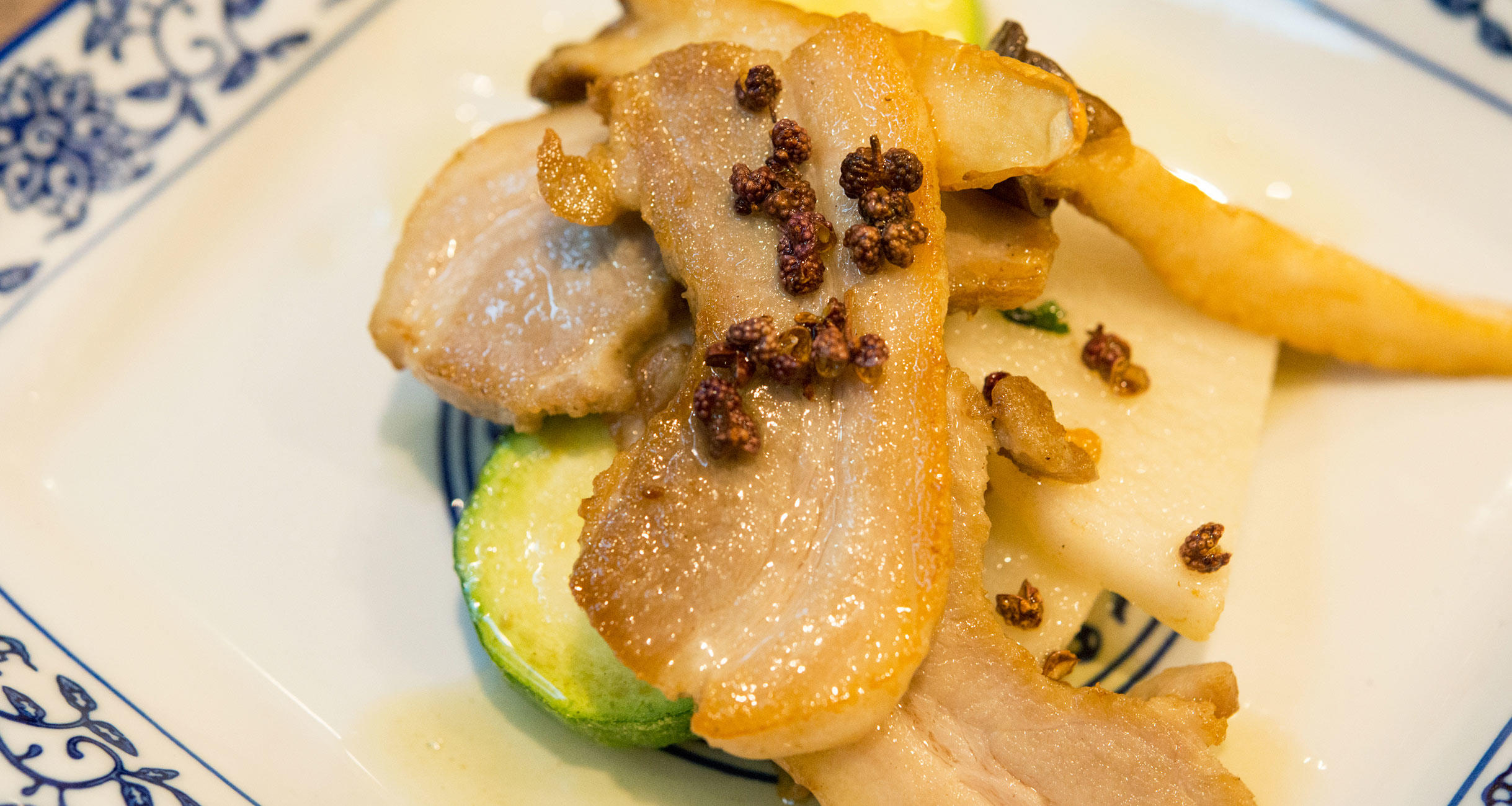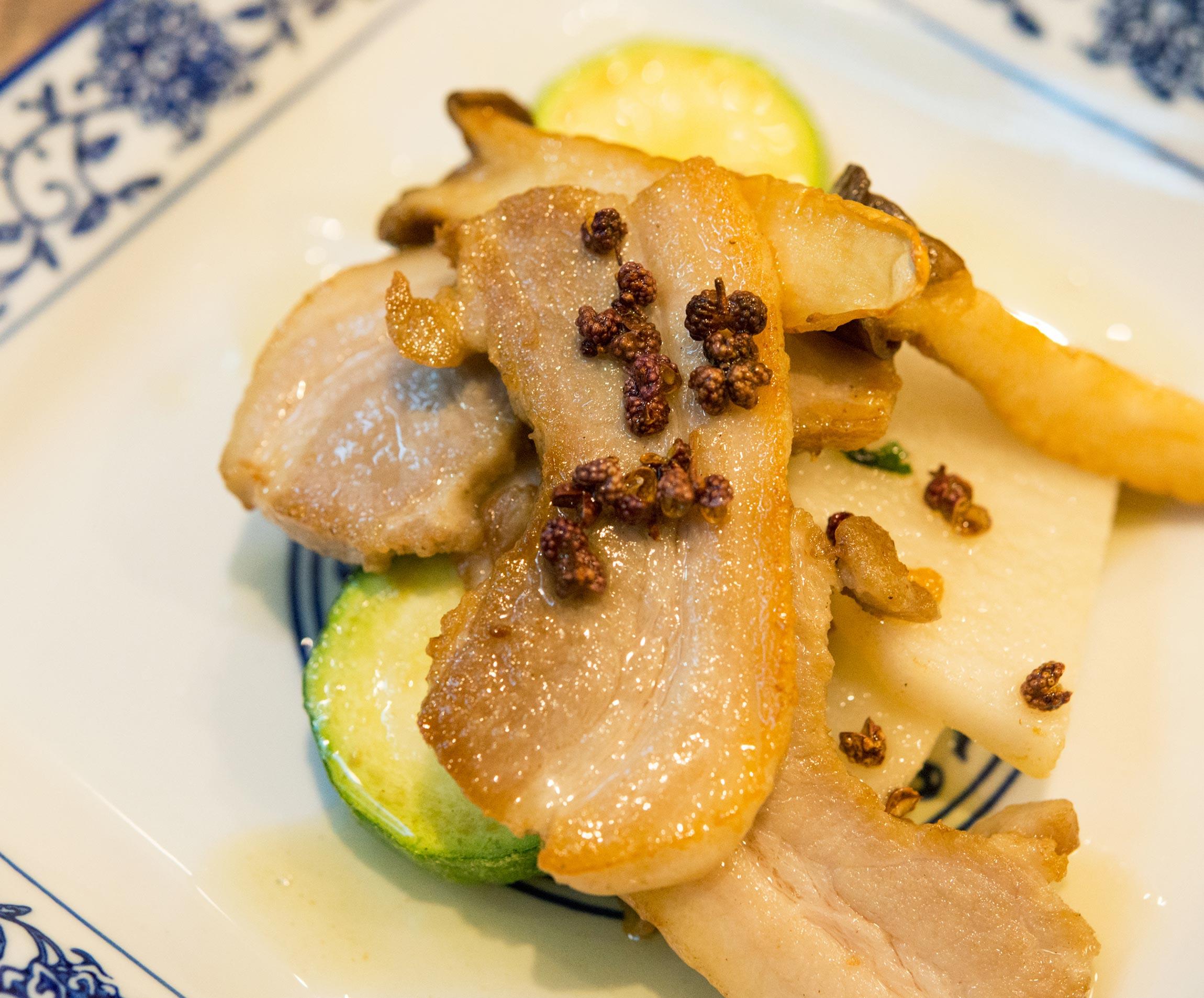 二皿目は塩熟成豚バラの山椒香り炒め。仕上げの調味には山椒の粒しか入れず、ほぼ味付けはなし。なのに、なぜこんなに旨味が豊かなのか?