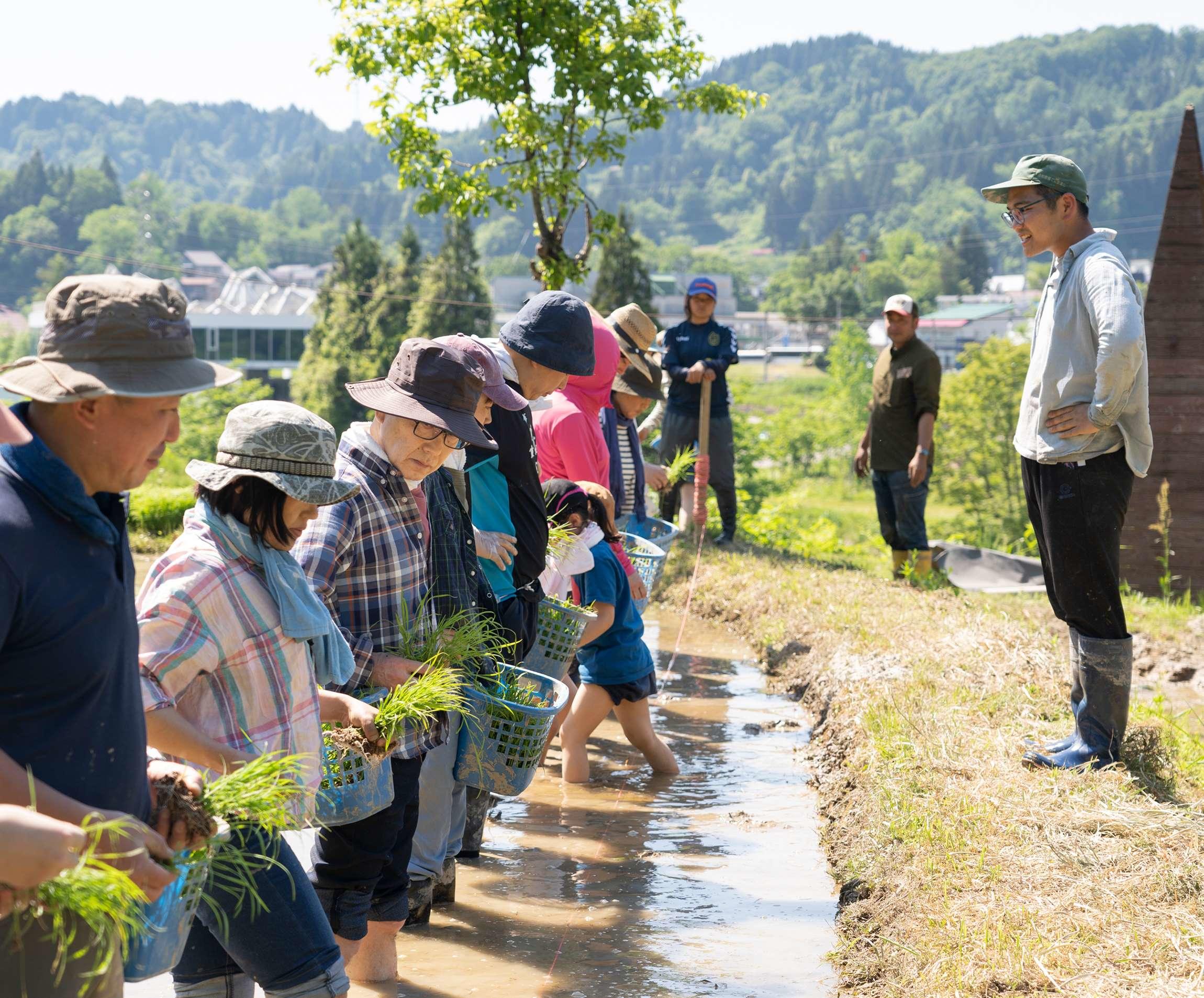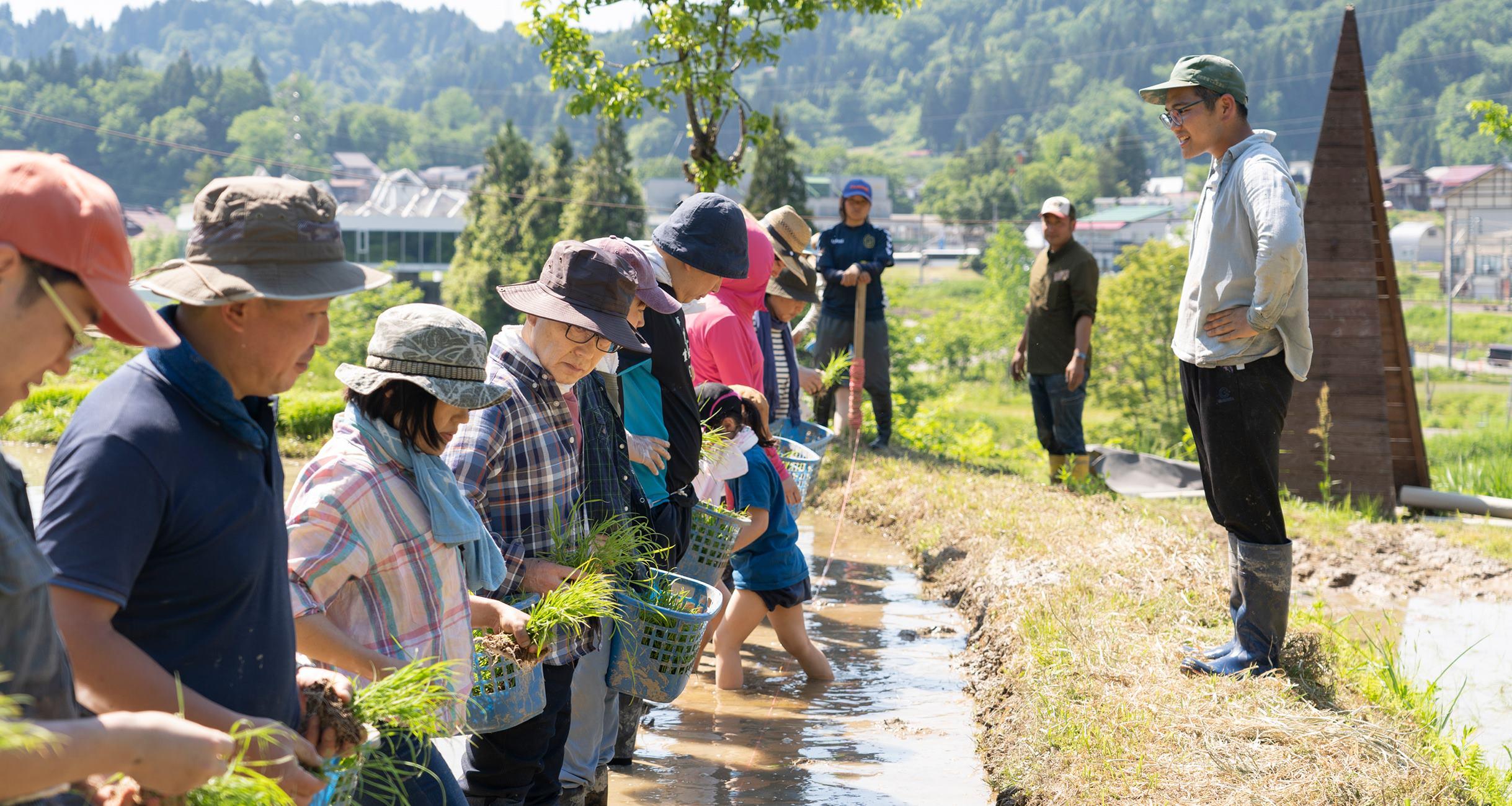 それまでぼくは一度も耳にしたことがなかった。ところが参加者の中にはすでに知っている人もいるらしい。ぐったり疲れた顔で休んでいた人たちが、その声を聞いて、さっと立ち上がった。「ヒモ植え」という魅力的な言葉に誘われて、みんないっせいに田んぼに入る。入学前の子どもからぼくのような60代まで、男女混合、年齢もさまざまだ。そういえば手植えが当たり前の昭和時代では、家族全員、親戚、隣家の人なども集合してひとつのグループをつくり、いっせいに「入田」したという。これぞまさに田植えの真骨頂である。