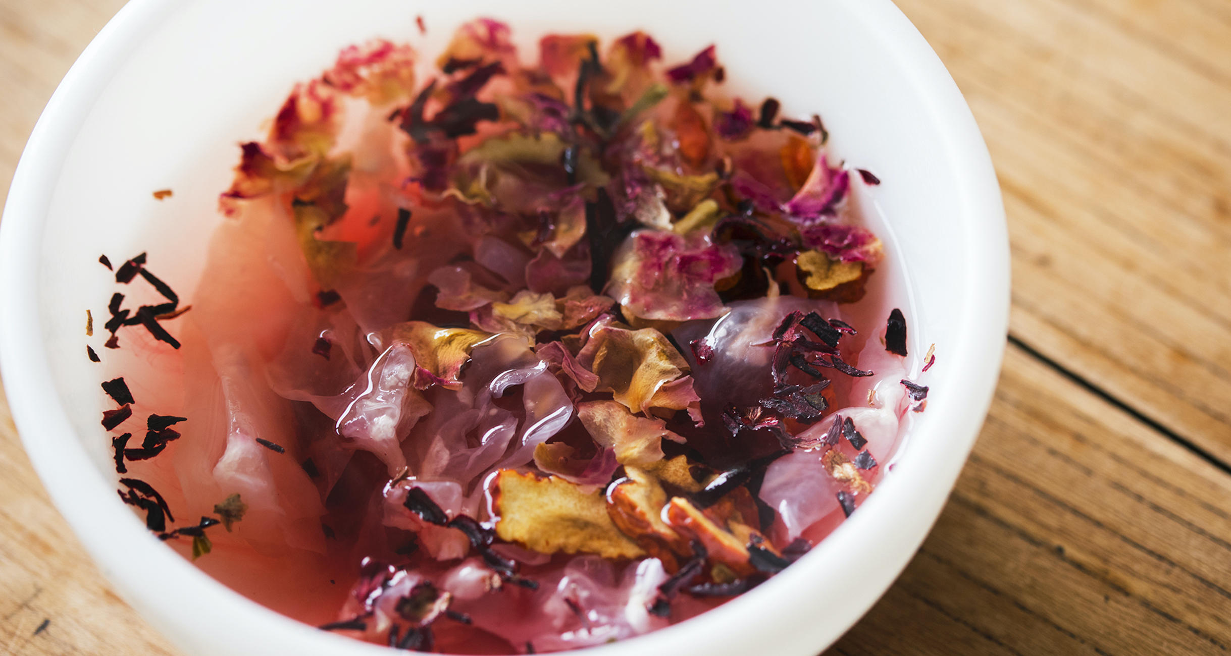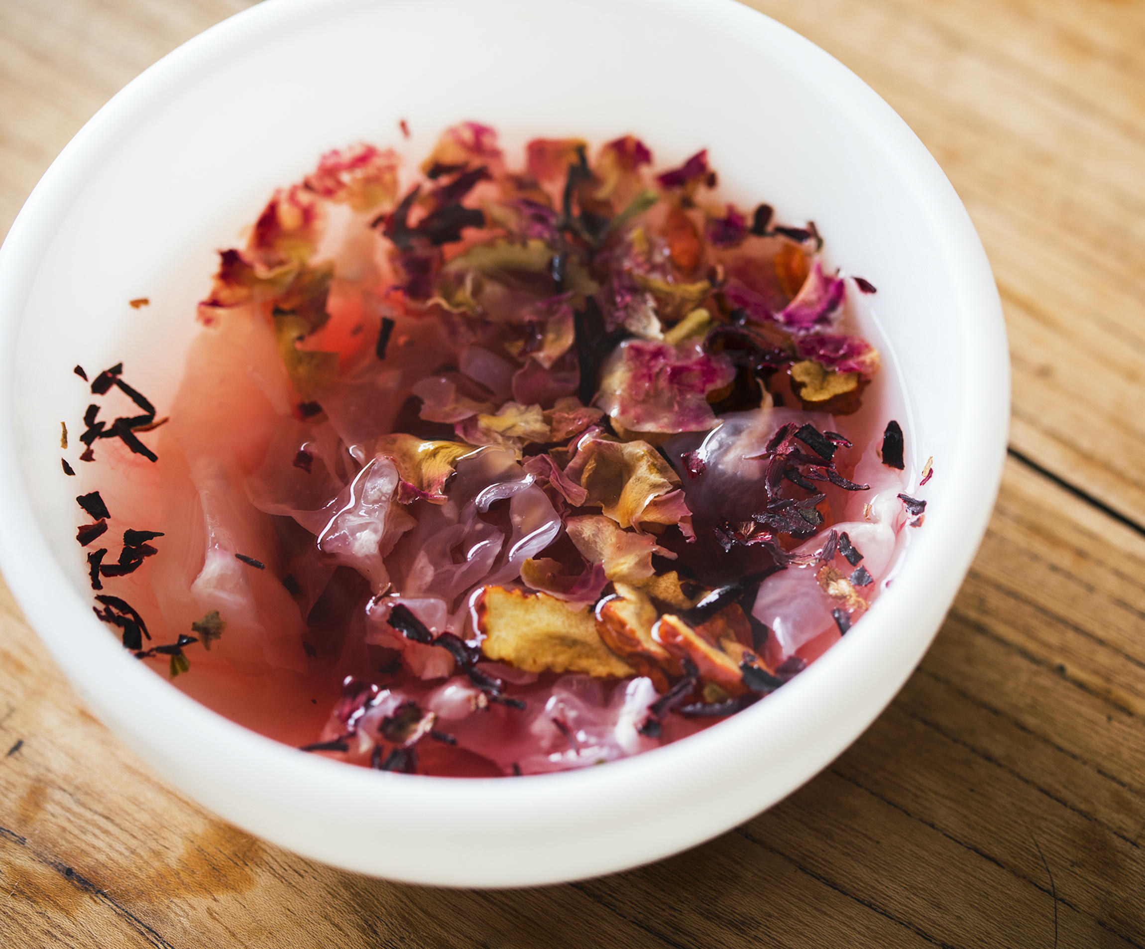 山田順子さんはそう言うと、手元の器に湯を注ぎ始めた。透明だった湯が器の中で、みるみる紅く染まっていく。ハイビスカスや、バラの花、白木耳がぷかぷかと浮き、幻想的な佇まいになった。