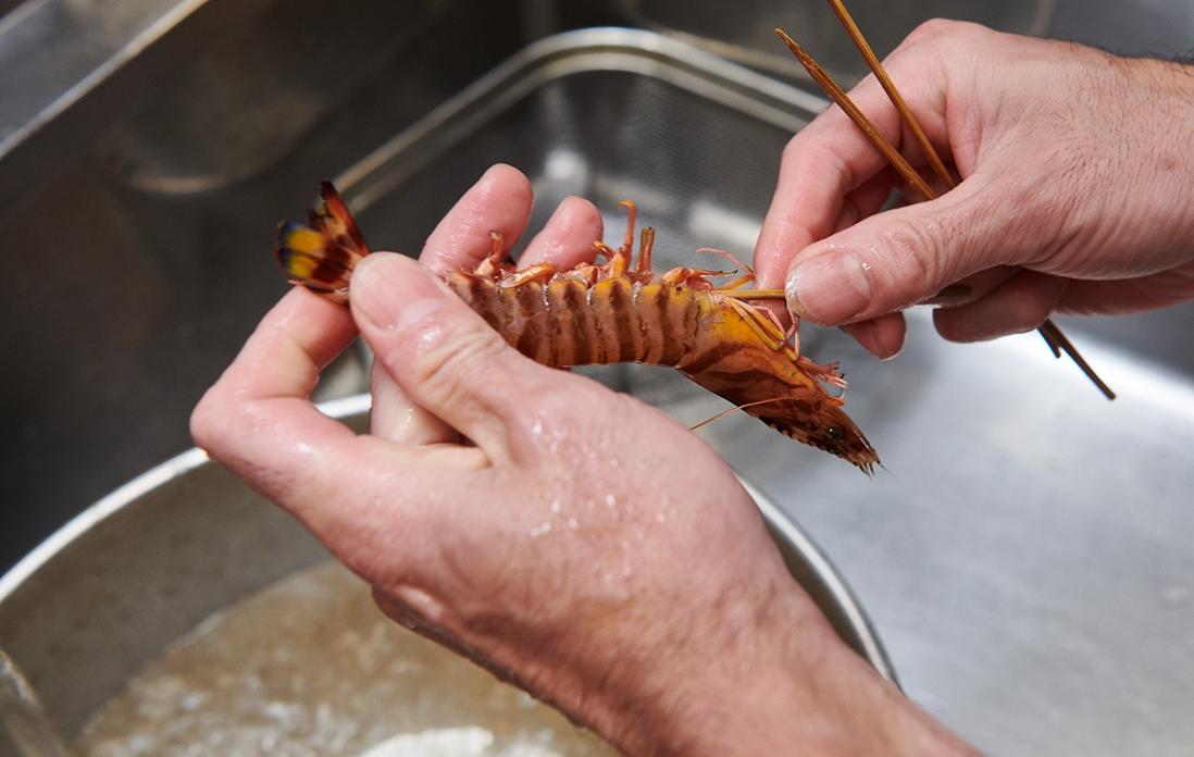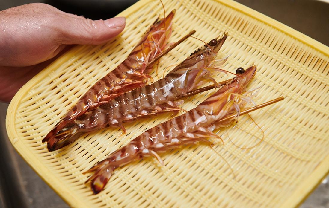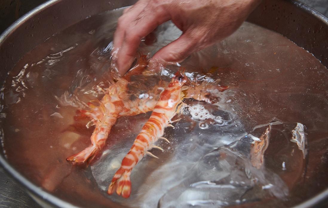 「車海老は天ぷらのように中心が半生の状態ではなく、しっかり火を入れます。当初は保存が目的だったのですが、熱を入れることで旨味、甘味が格段に増すのです。湯掻く時間は3、4分でしょうか。タイミングを見て冷水に取り、色止めをします。あとは常温で冷まして粗熱をとって完成です」