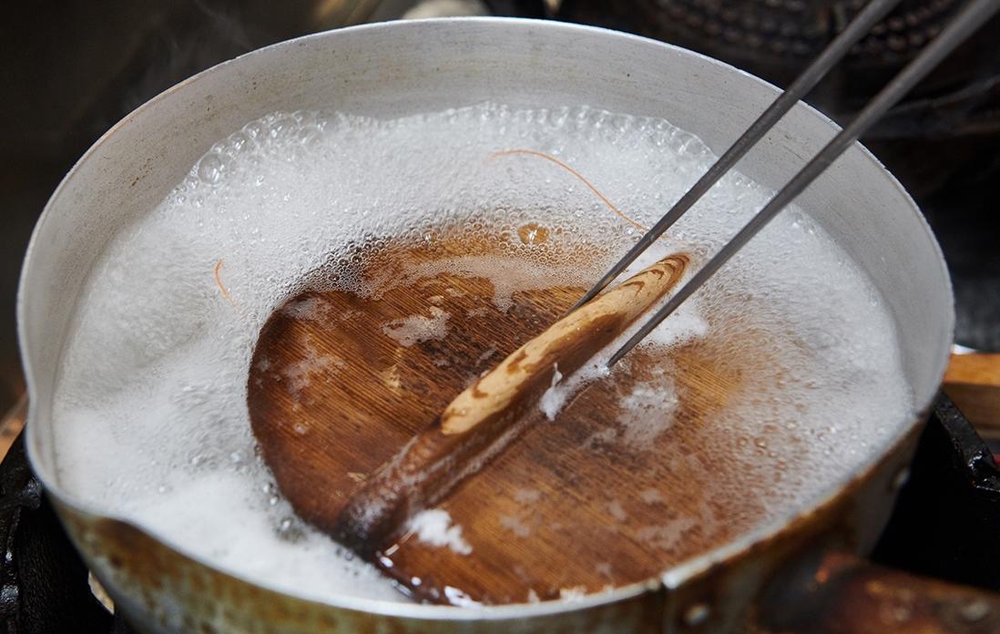 腰が曲がっていては鮨種にはできないので、ゆでる時は竹串を背中に打ってから沸騰した湯に入れる。「㐂寿司」四代目の油井一浩さんは、活きのいい海老ほどその色ははっきりと鮮やかになると語る。