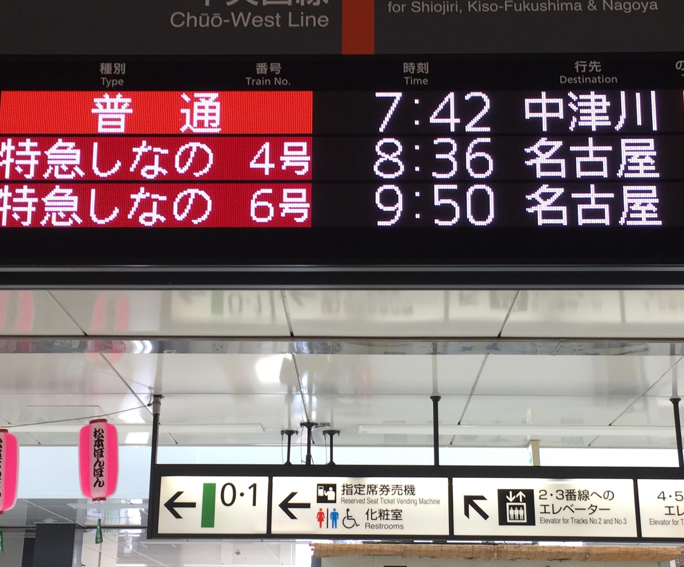 18きっぷで里帰りのスタートは、7月26日。おにぎりとお茶を買って松本発7時42分発の中津川行きの電車に乗った。平日の朝だけに中高生の姿が多いが、彼らが降りると車内は空き、木曽路に入ると観光客のグループが中心になった。近くに関西から来たと思しきおばちゃんグループがいて賑やかだ。松本~名古屋間は「特急しなの」にしか乗ったことがなかったが、各駅停車でのんびり移動すると一気に風情が増す。