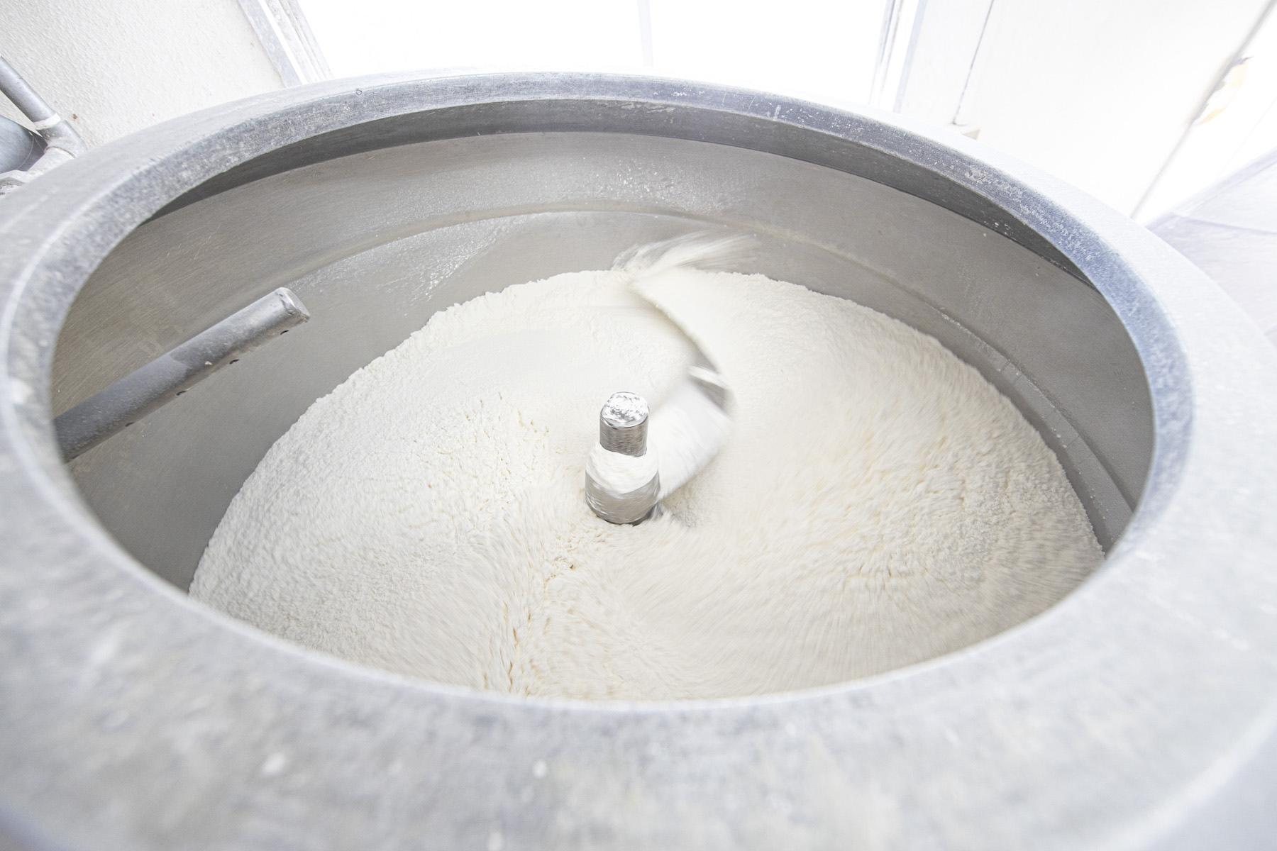 ミキシング中の小麦粉の状態には常に目を光らせ、小麦粉の硬さを指で確認しながら、最良の状態を見極める必要がある。