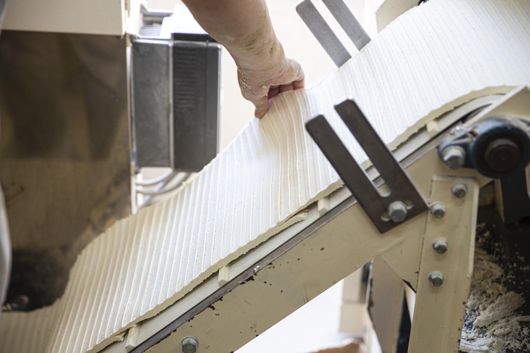 ミキシングが終わった小麦粉は、鋼鉄のローラーで板状に整形され、4つのローラーを通るうちに、少しずつうすくなっていく。最後に櫛形の歯を通り抜けて、生麺が完成すると、その先には篠棒と呼ばれる細い竹が待ち構えていて、すだれのように吊り上げられる。美しく真っ白なすだれは、そのまま二階の工場からオートメーションで、垂直に三階の干し場へと運ばれていく。