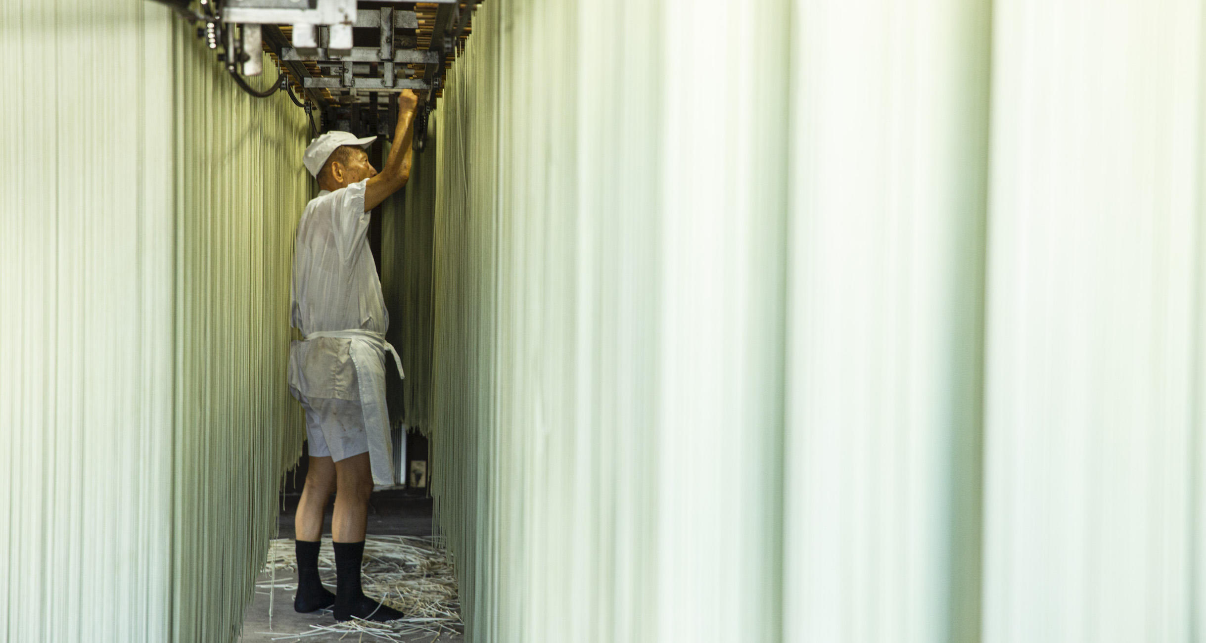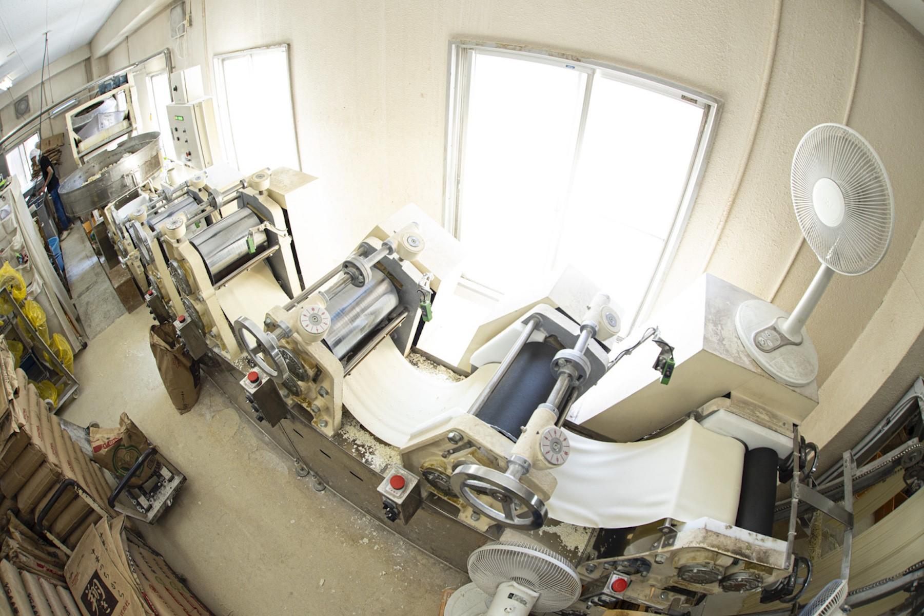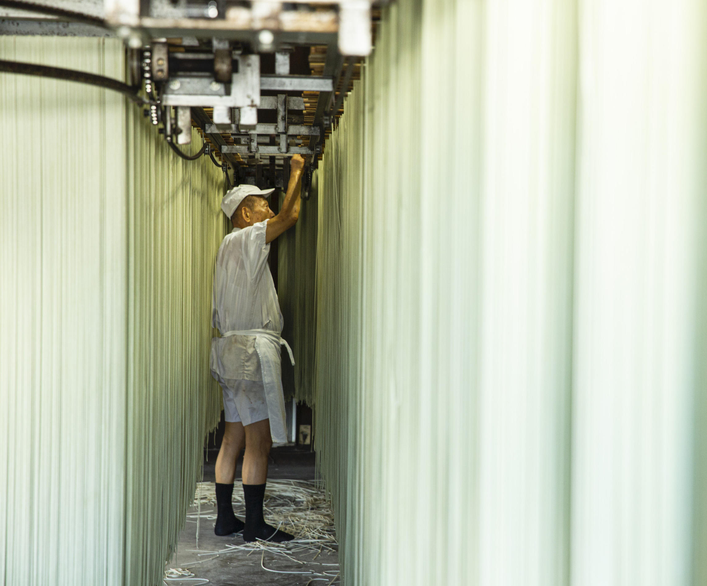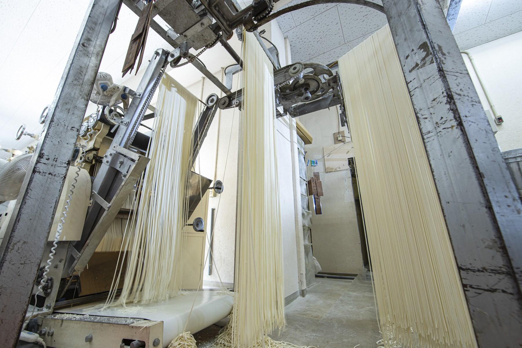 ムッとする暑さに、じんわり汗がにじむ。状態の良い麺をつくるには高い湿度を保つ必要があるそうだ。ギラギラと太陽が差し込む真夏だろうと関係はない。