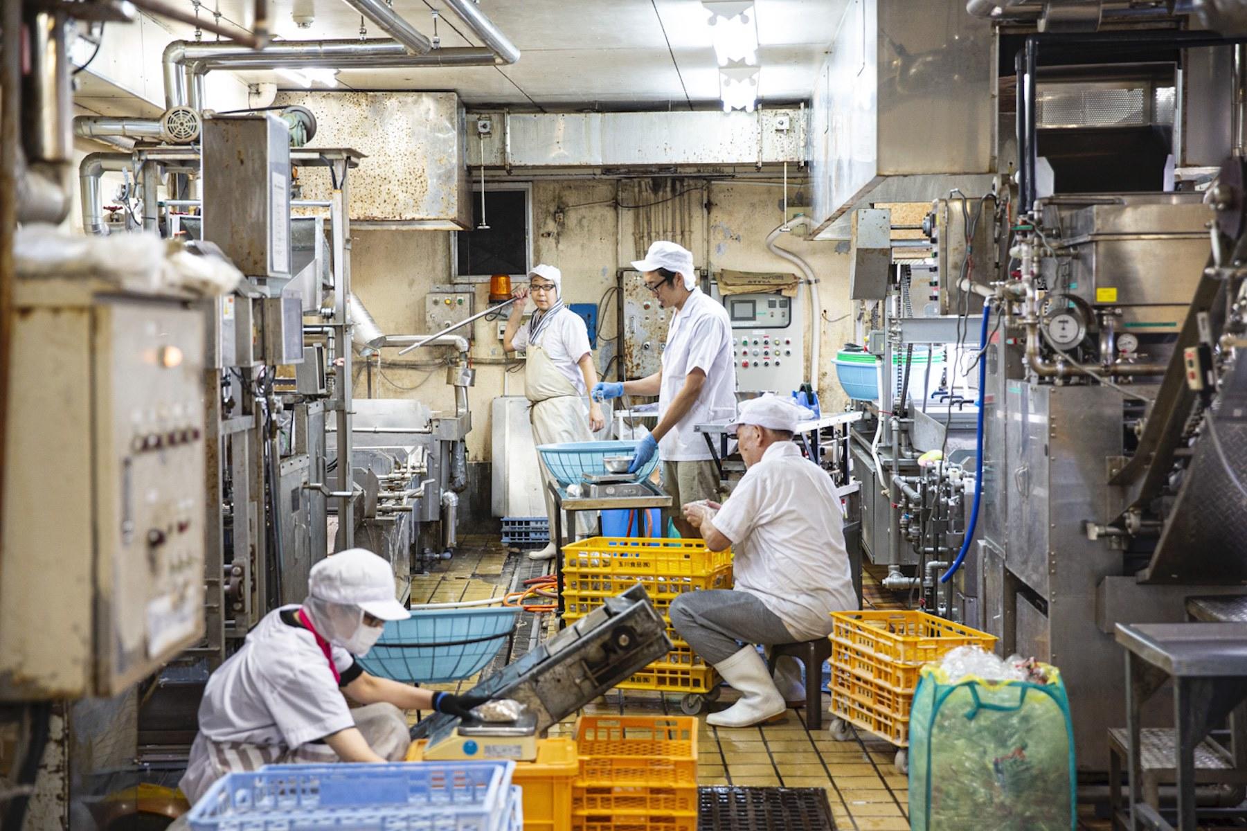 ゴウン、ゴウン、と轟音がする巨大な釜の中では、92度の湯を加えた200kgの小麦粉がミキシング中だ。これが「江戸玉川屋」が守り続けている伝統製法“湯捏ね”。