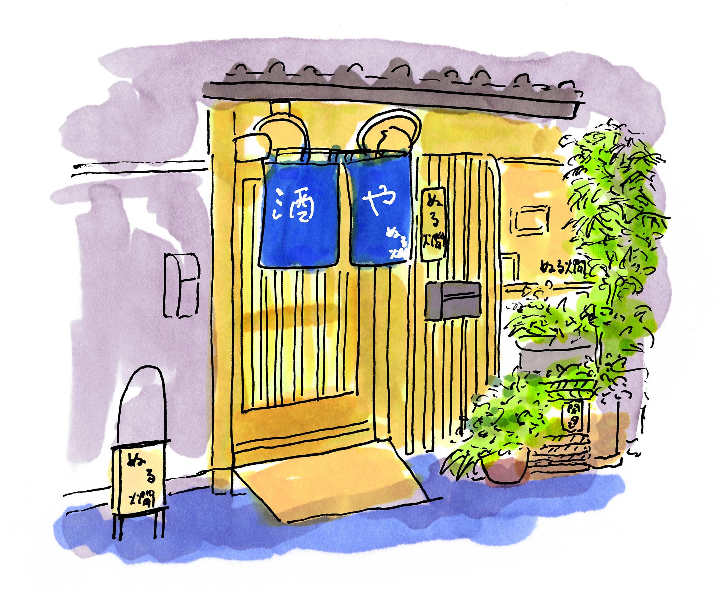 「ぬる燗」の引き戸を開ける。靴を抜いて上がると、そこがカウンター。畳敷きになっていて、座布団が配されている。