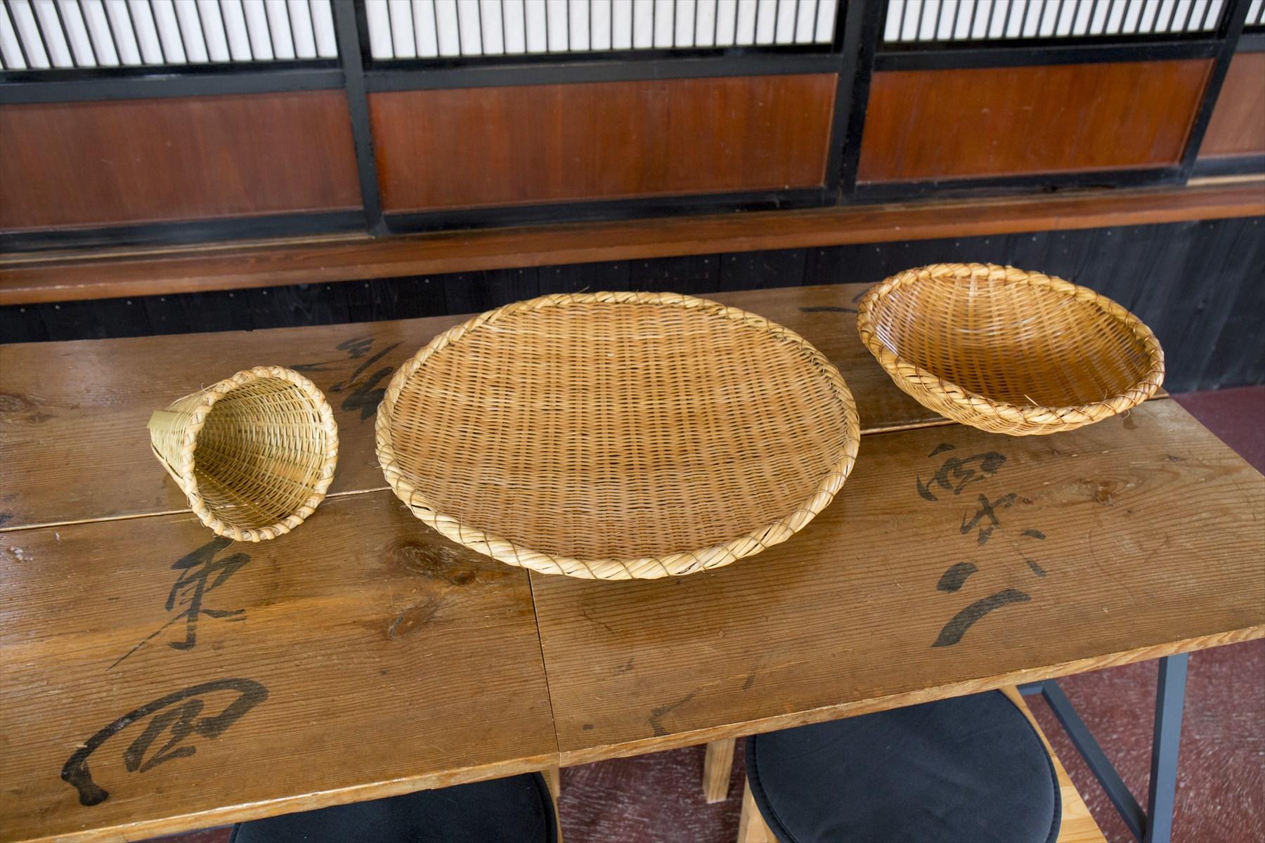 小物をディスプレイする棚は廃校になった小学校のランドセル入れ。もともと畳敷きだった居間の床板をはがして土間にした空間。そこに置かれるテーブルは、この古民家で穀物を納めるために使われていた「せいろ板」で制作。蕎麦をゆでる道具たちもまた、佐渡の職人が地元の竹でつくったものである。