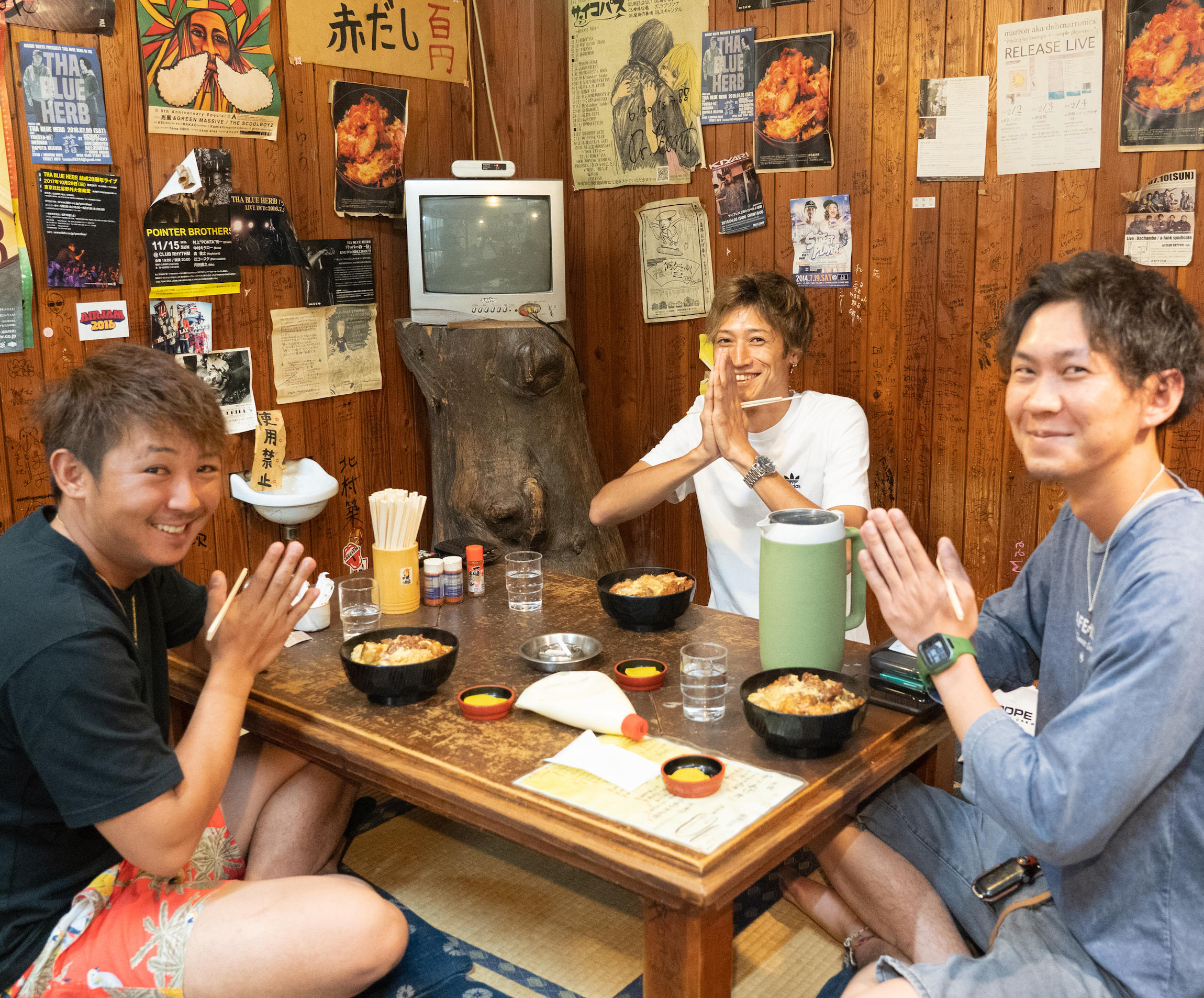 向かって左から弦さん、大貴さん、大喜さんの3人は26歳。伊勢周辺の町で、林業、漁業、サラリーマンをやっています。時々、誰からともなく声をかけてこの店に集まるとか。